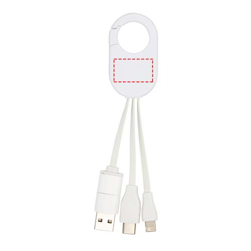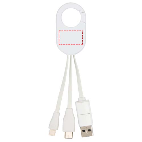 Cavo di ricarica 4-in-1 in plastica riciclata, connettori di ingresso USB-A e Tipo-C abbinati a connettori di uscita combinata di Tipe-C e Lightning/Micro USB, moschettone incorporato.
