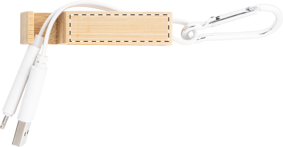 Cavo di ricarica USB con moschettone in alluminio riciclato e supporto per cellulare in bambù. Connettori micro USB, USB-C e Lightning ed ingressi USB e USB-C. Personalizzabile. Articolo eco-friendly, ecologico e sostenibile.