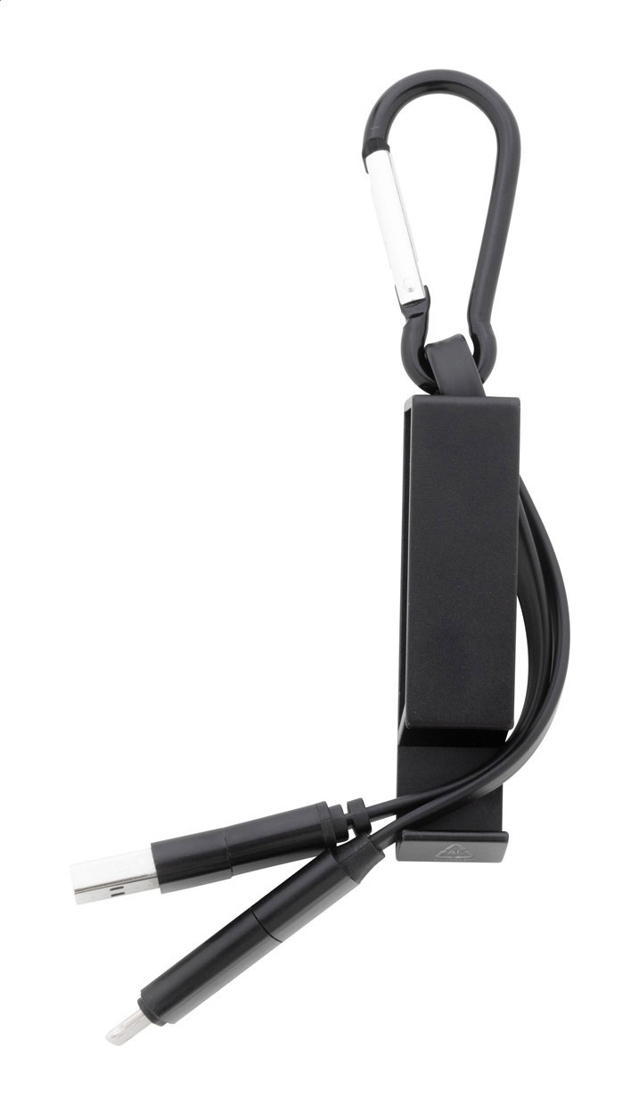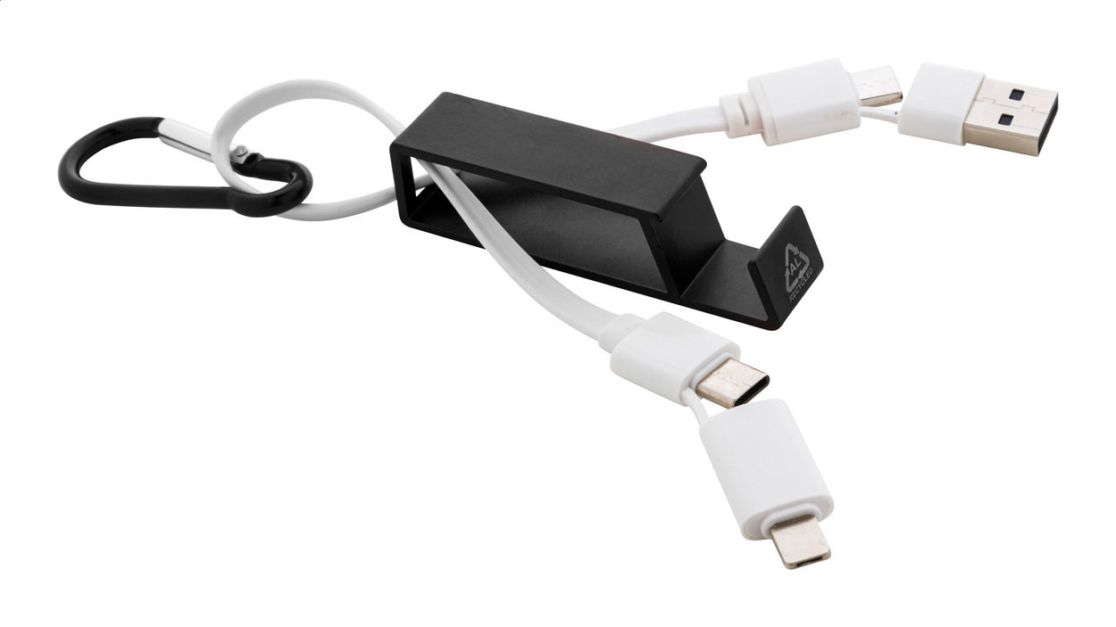 Cavo di ricarica USB con moschettone in alluminio riciclato e supporto per cellulare con funzione di apribottiglie. Connettori micro USB, USB-C e Lightning ed ingressi USB e USB-C. Personalizzabile. Articolo eco-friendly, ecologico e sostenibile.