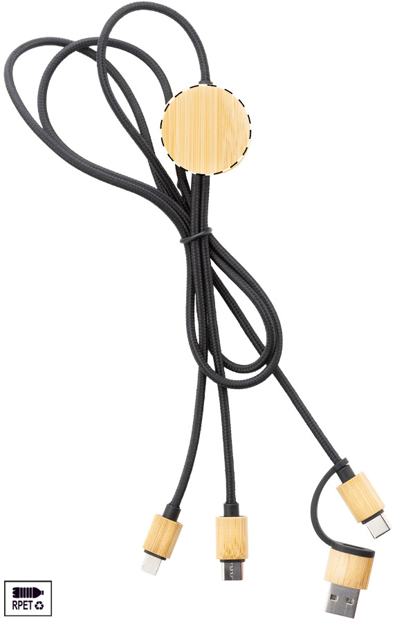 Cavo di ricarica USB in RPET e bambù con connettori micro USB, USB-C e Lightning ed ingressi USB e USB-C. Lunghezza del cavo: 100 cm. Articolo eco-friendly, ecologico e sostenibile.