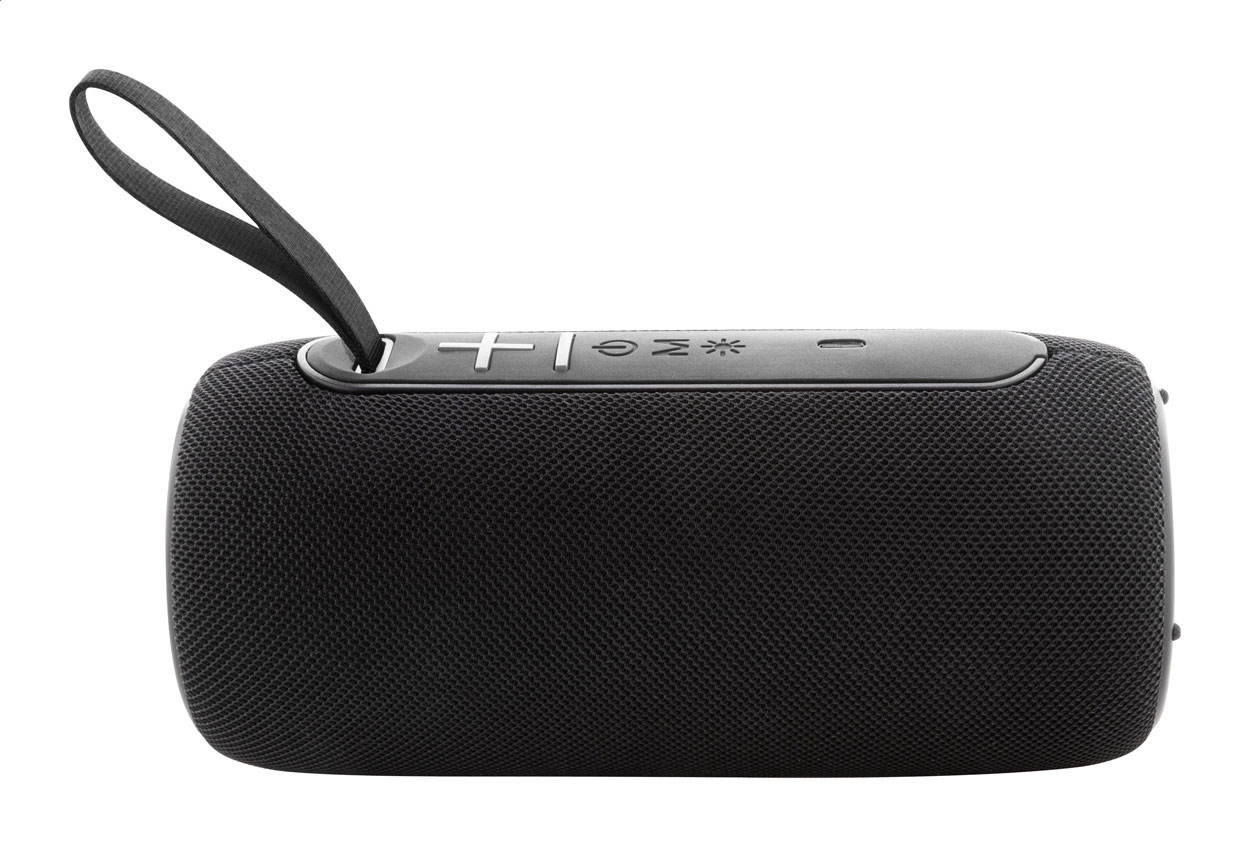 Altoparlante wireless rivestito in tessuto di poliestere con luce LED multicolore e cinghia di trasporto. Con 2 altoparlanti, funzione di chiamata in vivavoce e batteria ricaricabile integrata (1200 mAh). Cavo di ricarica USB incluso. Personalizzabile.
