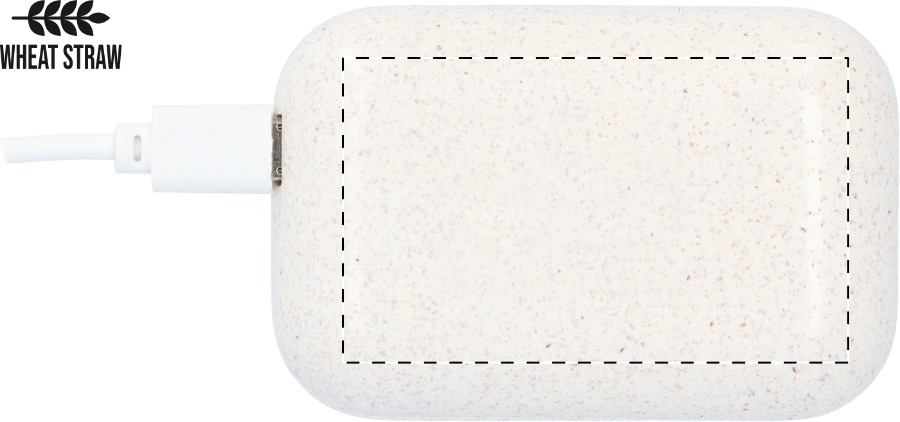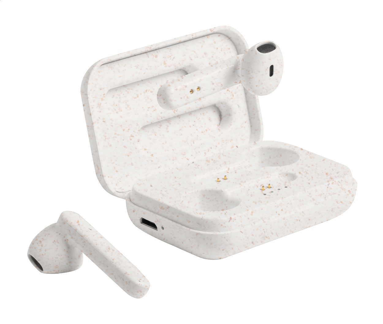 Auricolari stereo true wireless (TWS), Plastica ecologica di paglia di grano, con funzione di chiamata in vivavoce e custodia per il caricabatterie. Incluso cavo di ricarica USB. In scatola di carta kraft. Articolo eco-friendly, ecologico e sostenibile. Personalizzabile.