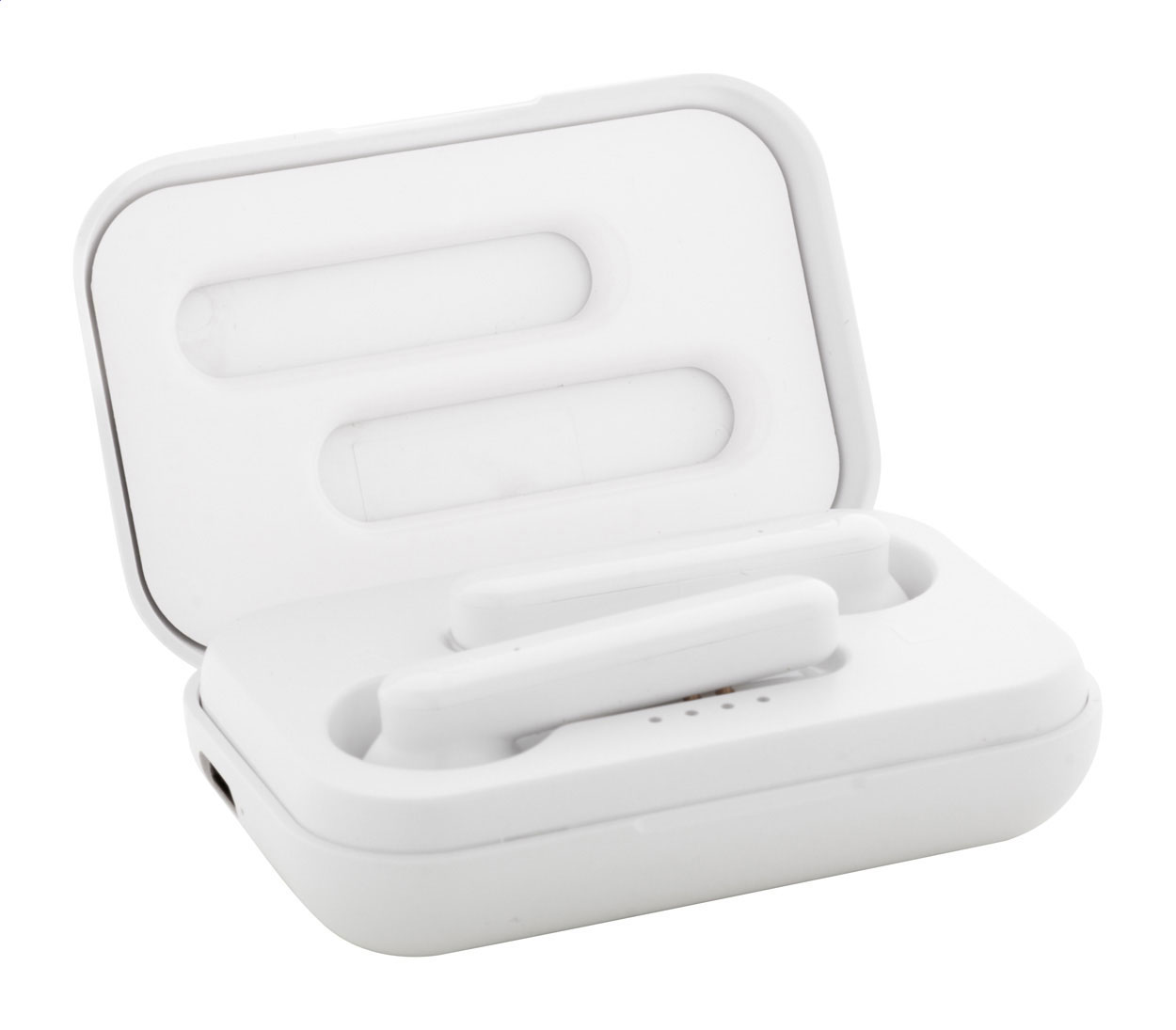 Auricolari stereo true wireless (TWS) in plastica ABS riciclata con funzione di chiamata in vivavoce, in custodia di plastica con batteria da 400 mAh. Incluso cavo di ricarica USB. Personalizzabile. Articolo eco-friendly, ecologico e sostenibile.
