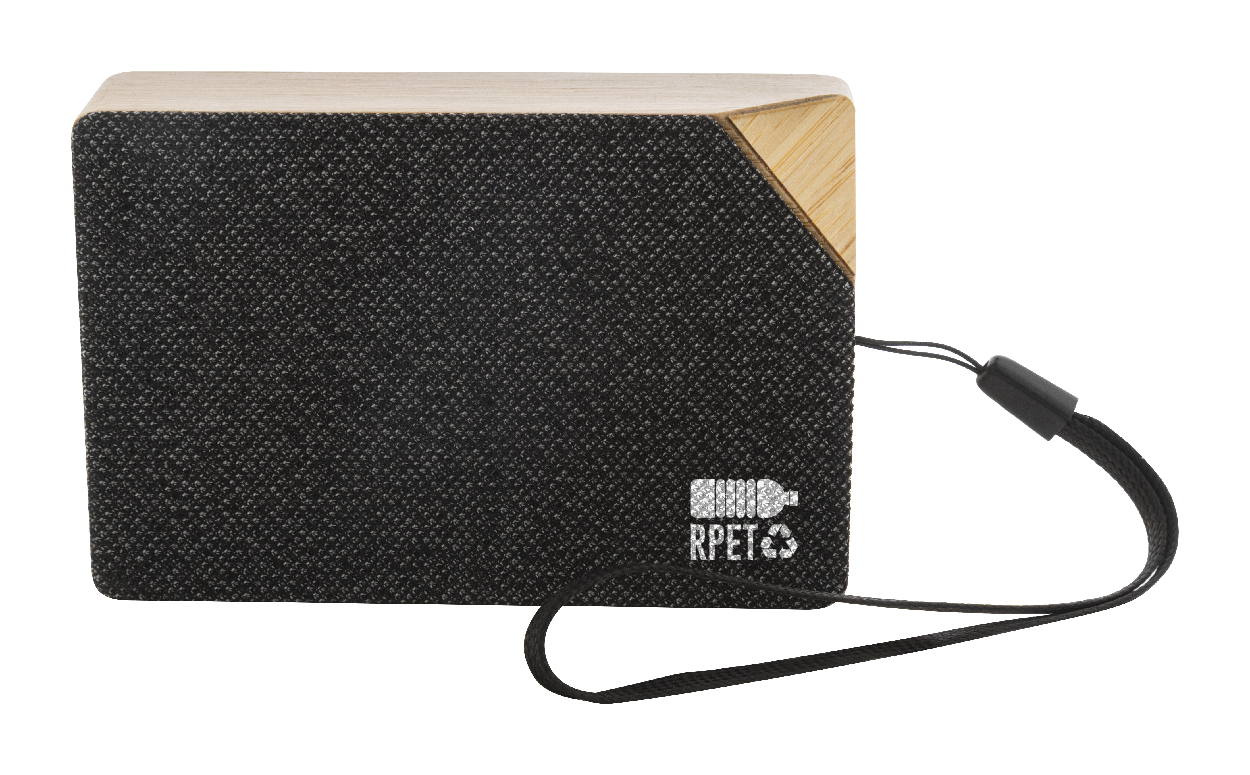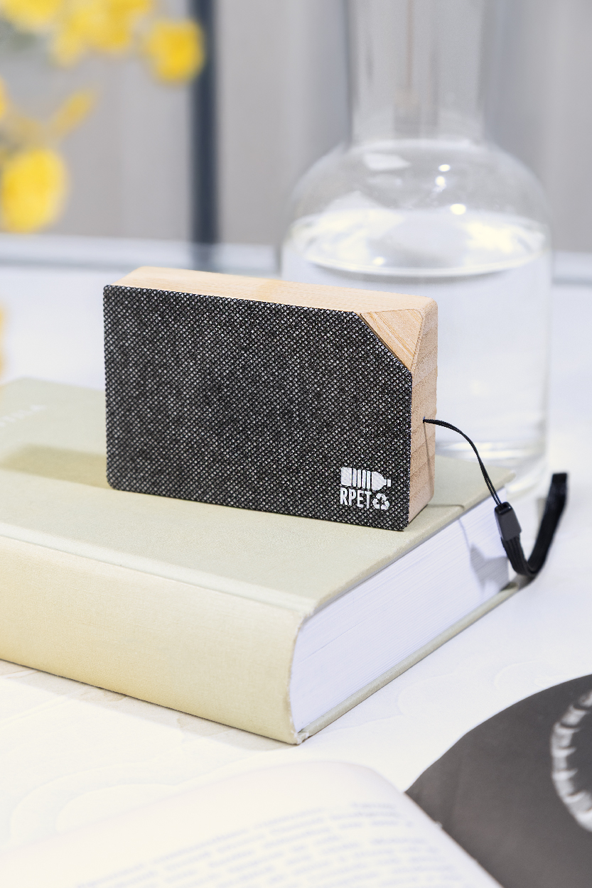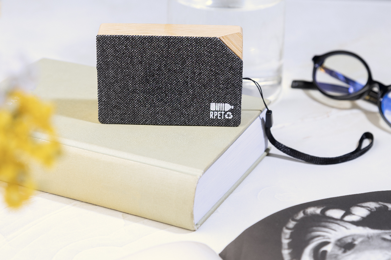 Cassa wireless in bambù con tessuto in poliestere RPET, caricatore solare integrato e batteria ricaricabile (300 mAh). Cavo di ricarica USB Incluso. Articolo eco-friendly, ecolocigo e sostenibile. Personalizzabile.
