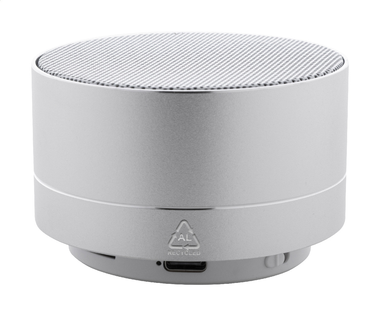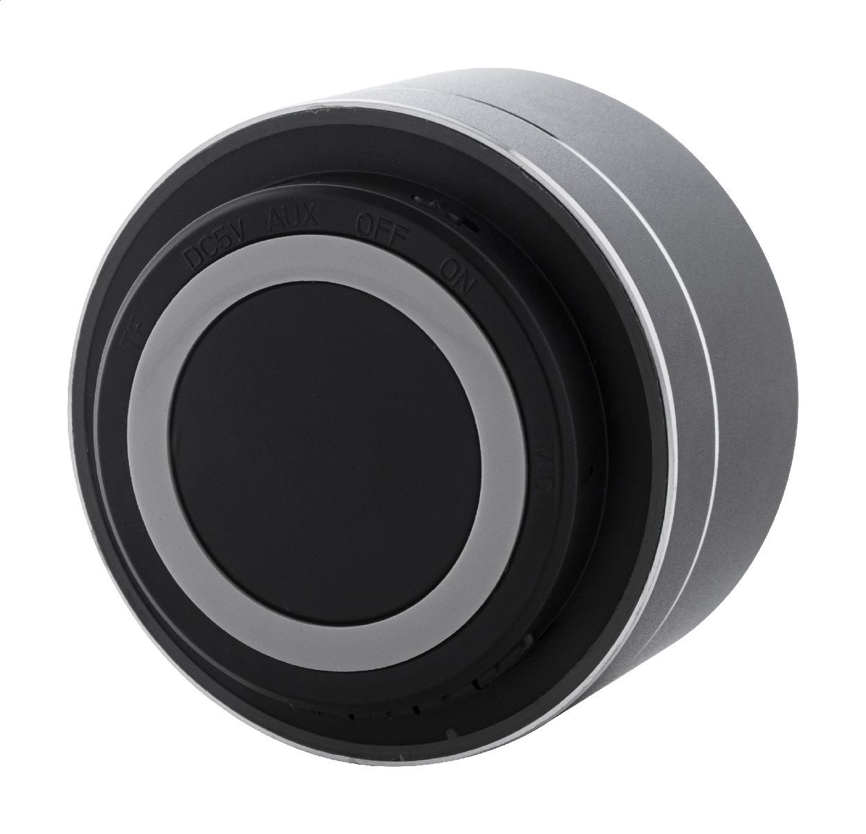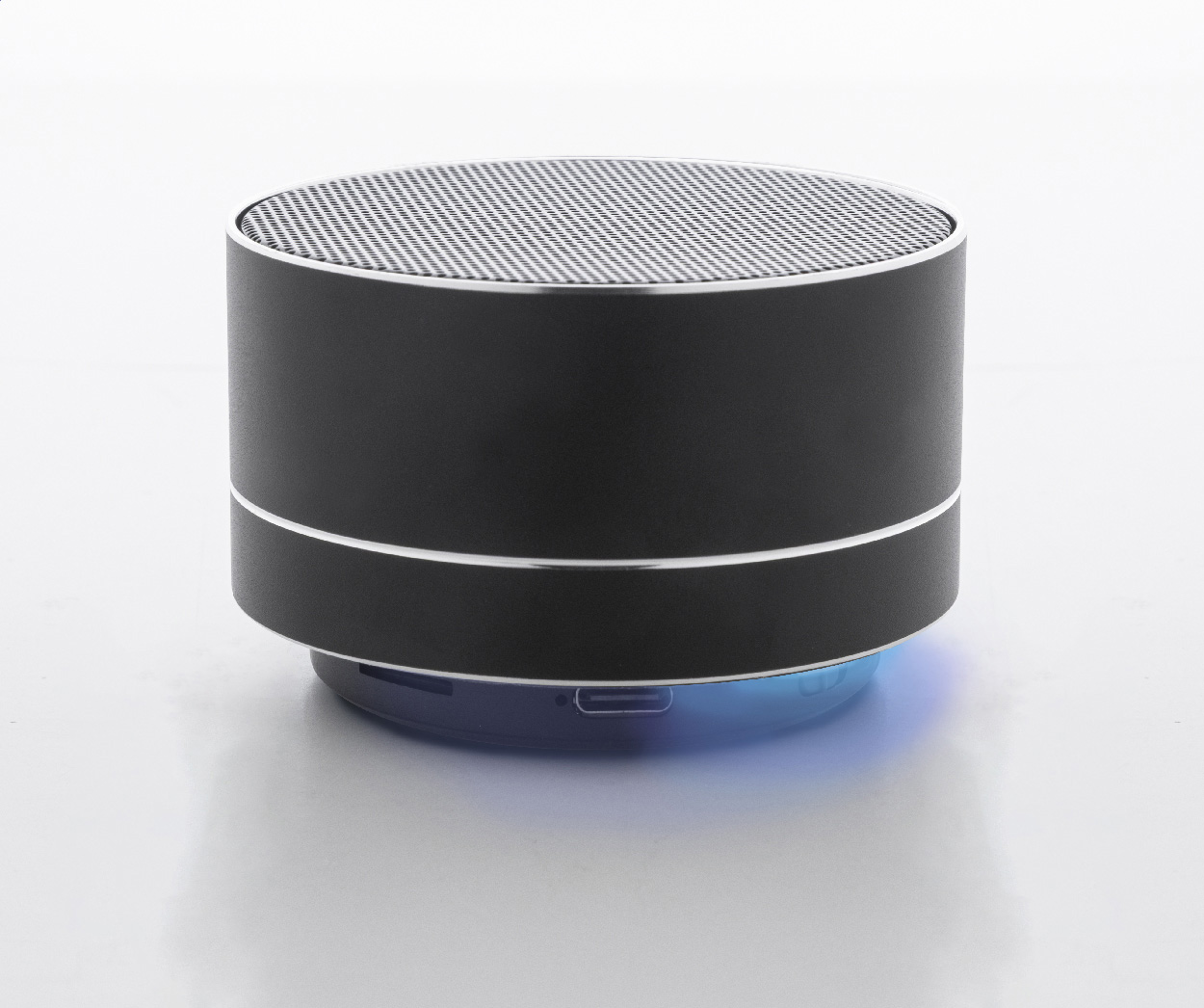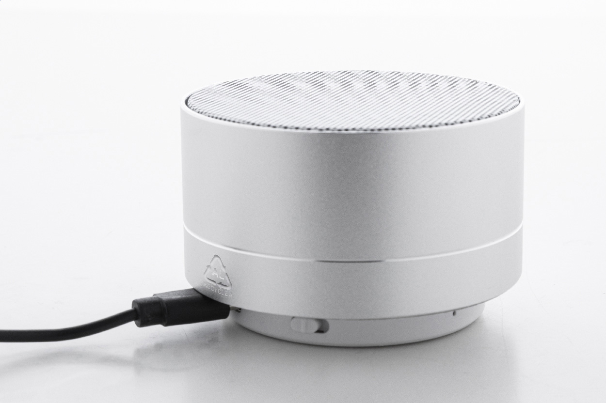 Cassa wireless in alluminio riciclato con rete metallica, luce LED sul fondo e batteria ricaricabile (300 mAh). Con funzioni di chiamata in vivavoce e riproduzione MP3 su micro SD. Cavo di ricarica USB incluso. Articolo eco-friendly, ecolocigo e sostenibile. Personalizzabile.