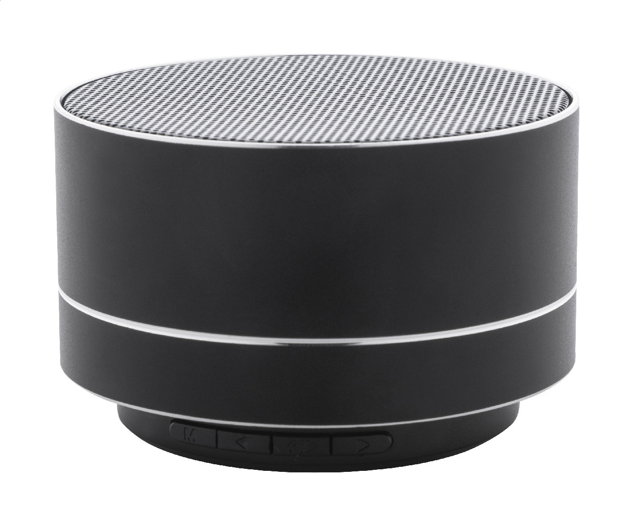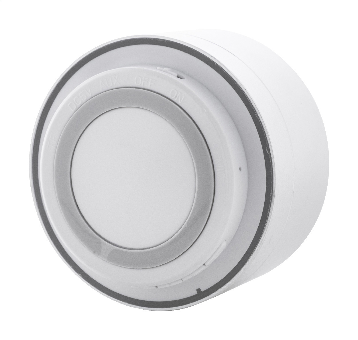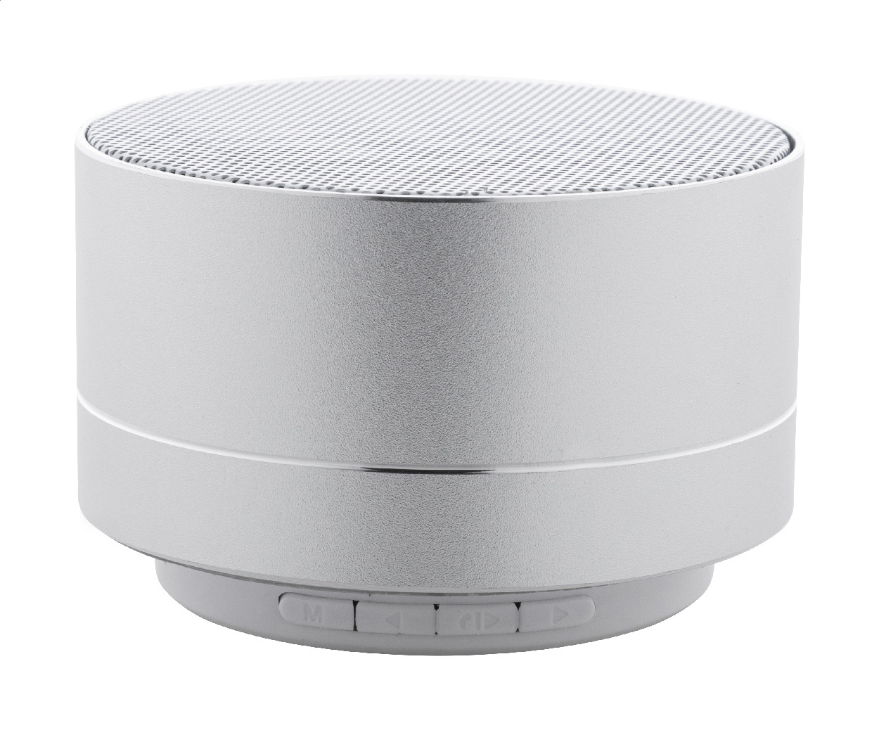 Cassa wireless in alluminio riciclato con rete metallica, luce LED sul fondo e batteria ricaricabile (300 mAh). Con funzioni di chiamata in vivavoce e riproduzione MP3 su micro SD. Cavo di ricarica USB incluso. Articolo eco-friendly, ecolocigo e sostenibile. Personalizzabile.