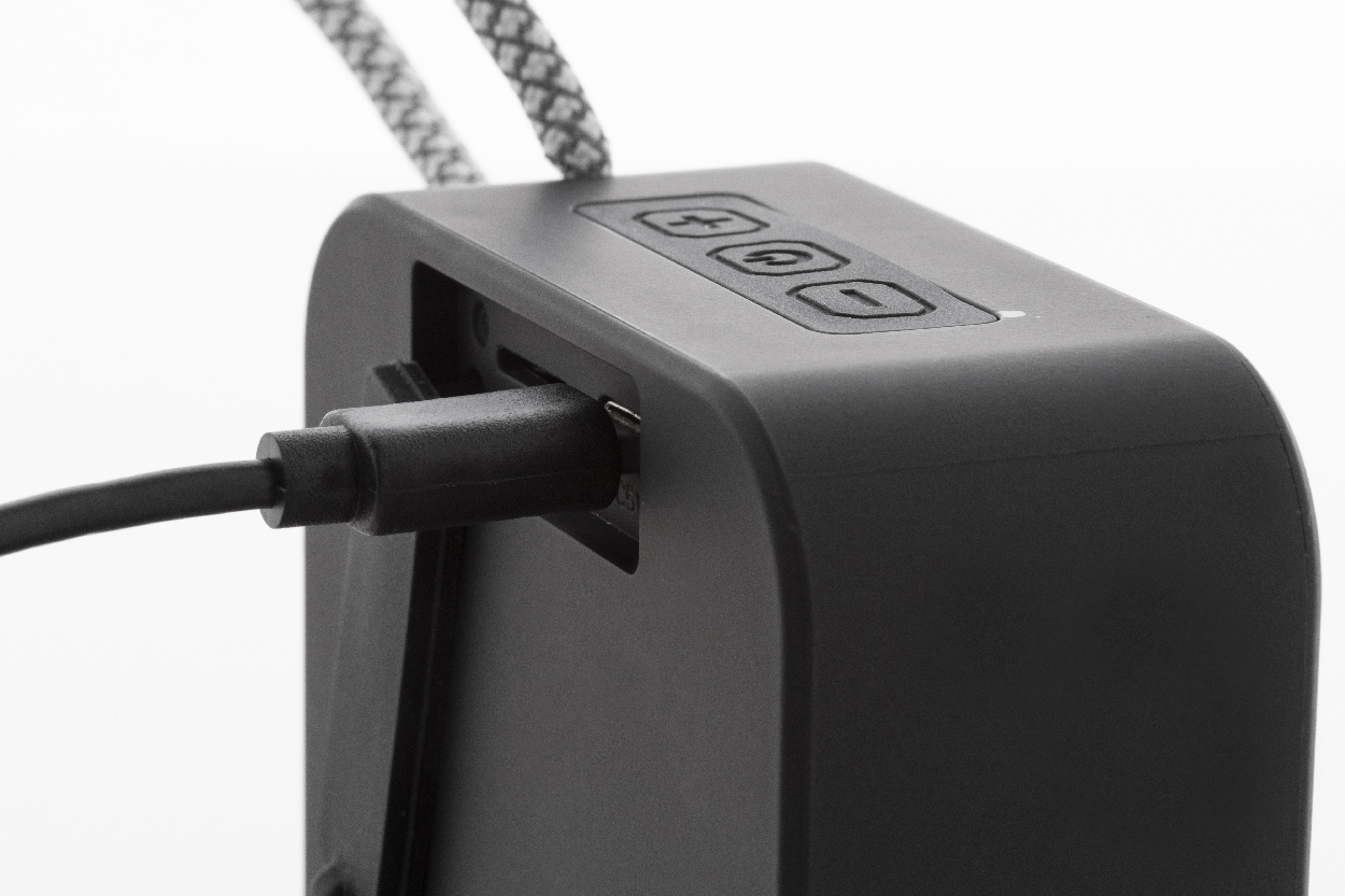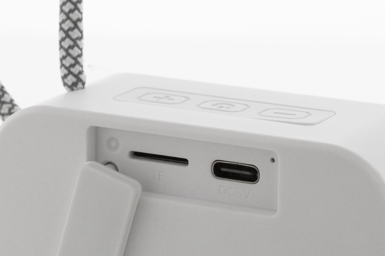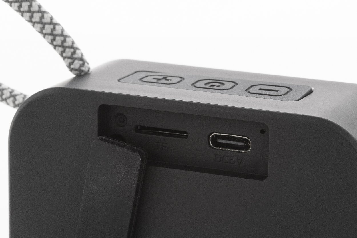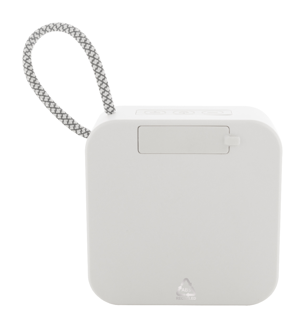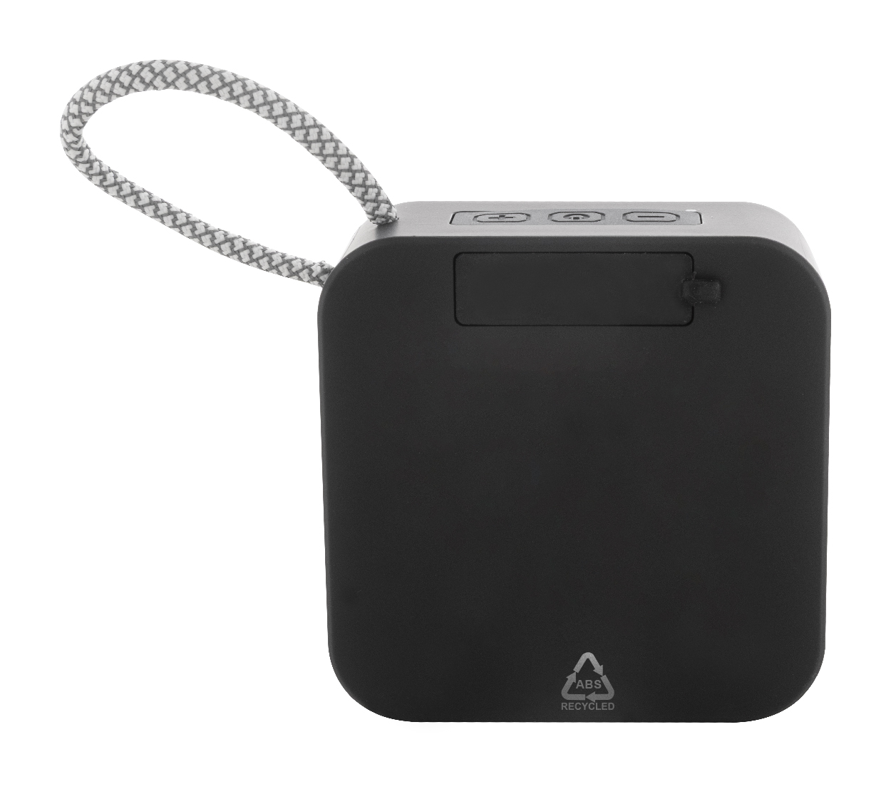 Cassa wireless in ABS riciclato con griglia metallica, batteria ricaricabile (300 mAh) e funzione di riproduzione micro SD MP3. Cavo di ricarica USB incluso. Articolo eco-friendly, ecolocigo e sostenibile. Personalizzabile.