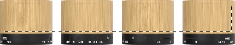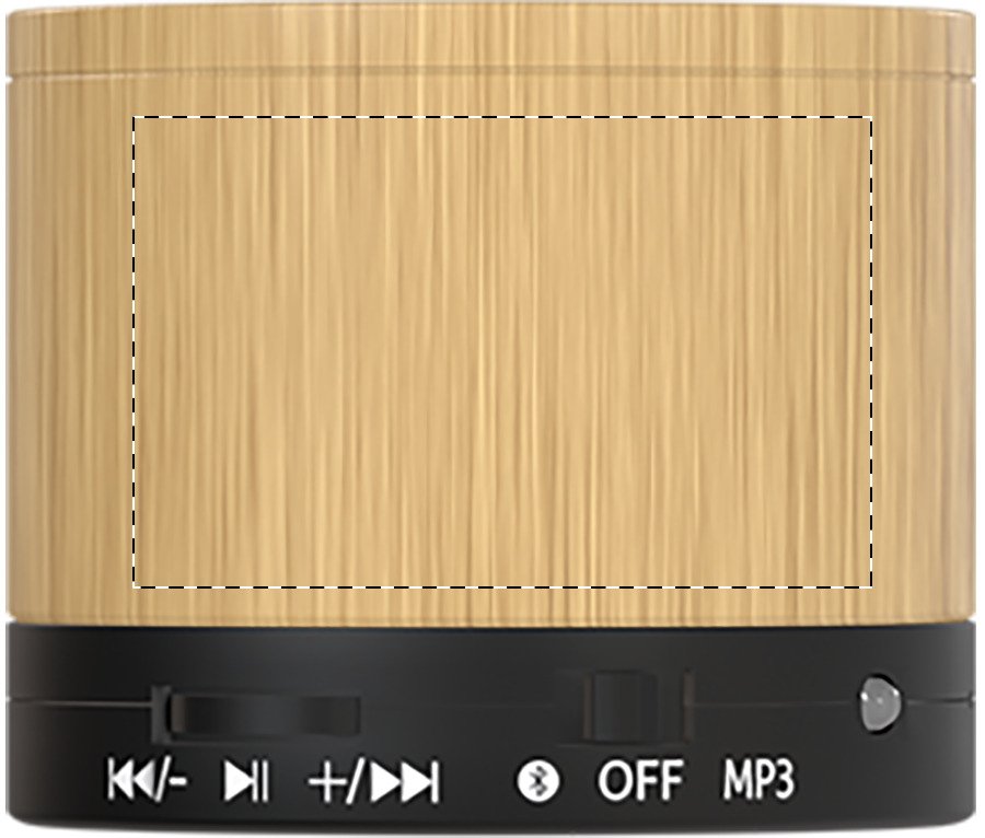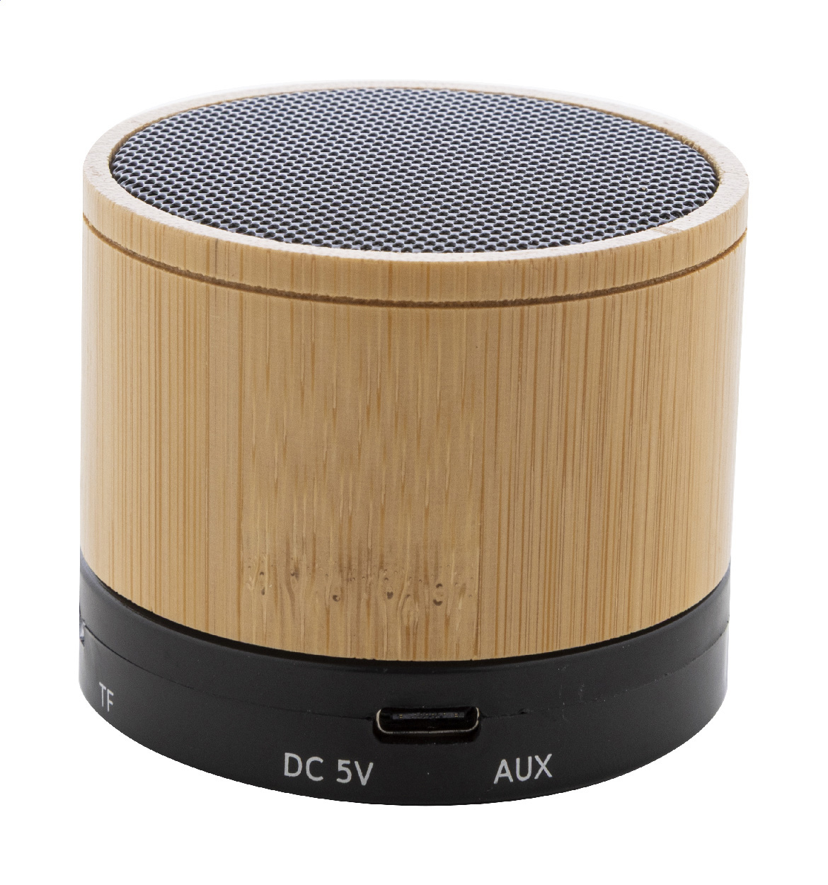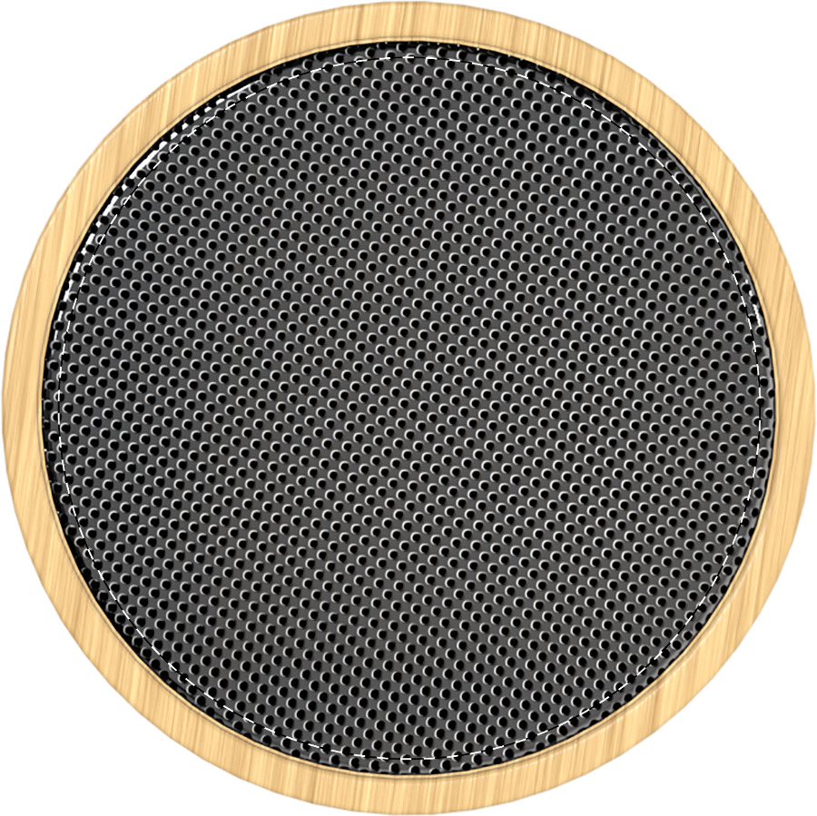 Cassa wireless in ABS riciclato e bambù con rete metallica e batteria ricaricabile (300 mAh). Con funzione di chiamata in vivavoce e riproduzione di MP3 su micro SD. Cavo di ricarica USB incluso. Articolo eco-friendly, ecolocigo e sostenibile. Personalizzabile.