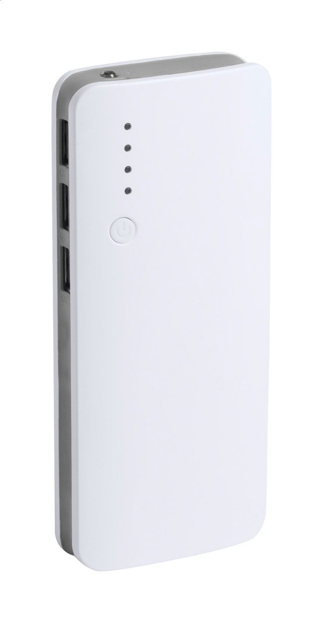 Power bank USB in plastica con 3 porte di ricarica e batteria da 10000 mAh. Senza cavo di ricarica. Personalizzabile a colori o con stampa nominativa.