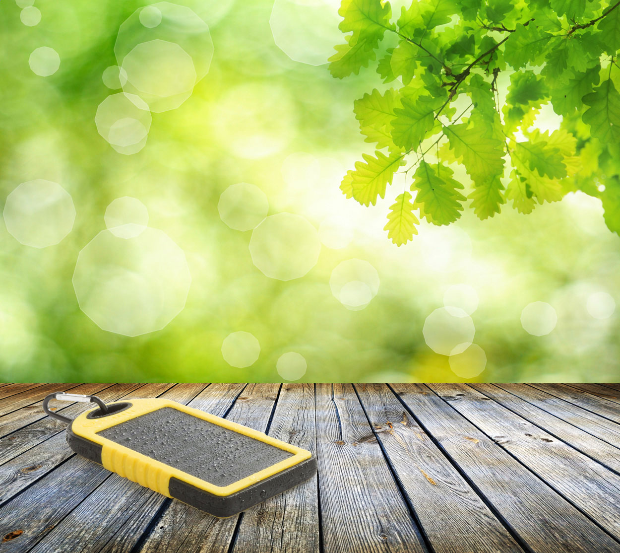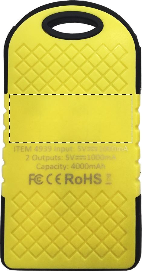 USB power bank da 4000 mAh a ricarica solare, corpo in plastica e silicone e 1 luce LED. Compreso cavo di ricarica micro USB. Personalizzabile solo con adesivo vinilico.
