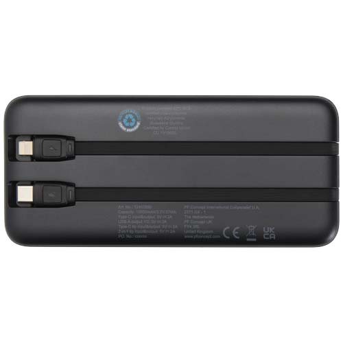Power bank da 10.000 mAh, in plastica ABS riciclata, due cavi integrati, uno di Tipo-C e uno combinato Lightning/micro-USB, oltre a due uscite USB-A e una porta di ingresso/uscita di Tipo-C. Indicatore LED per lo stato di ricarica. Articolo eco-friendly, ecologico e sostenibile. Personalizzabile.