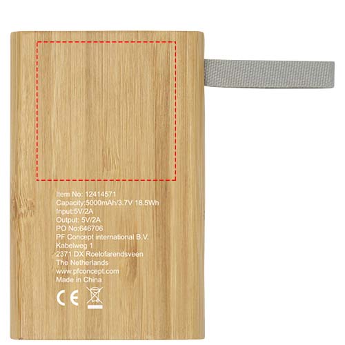 Power bank, in bambù, 5000 mAh di carica di riserva per telefoni cellulari o altri dispositivi digitali. Indicatori LED e laccetto in PET riciclato. Confezionato in una scatola regalo e fornito con manuale di istruzioni (entrambi realizzati in materiale ecosostenibile). Cavo di ricarica Micro-USB incluso.