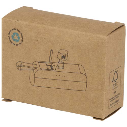 Power bank in plastica riciclata, con connettore di Tipo-C integrato, un supporto per telefono pieghevole incorporato e un cavo 2-in-1 integrato con connettore Lightning/micro-USB. Porta di ingresso/uscita di Tipo-C. Articolo eco-friendly, ecologico e sostenibile.