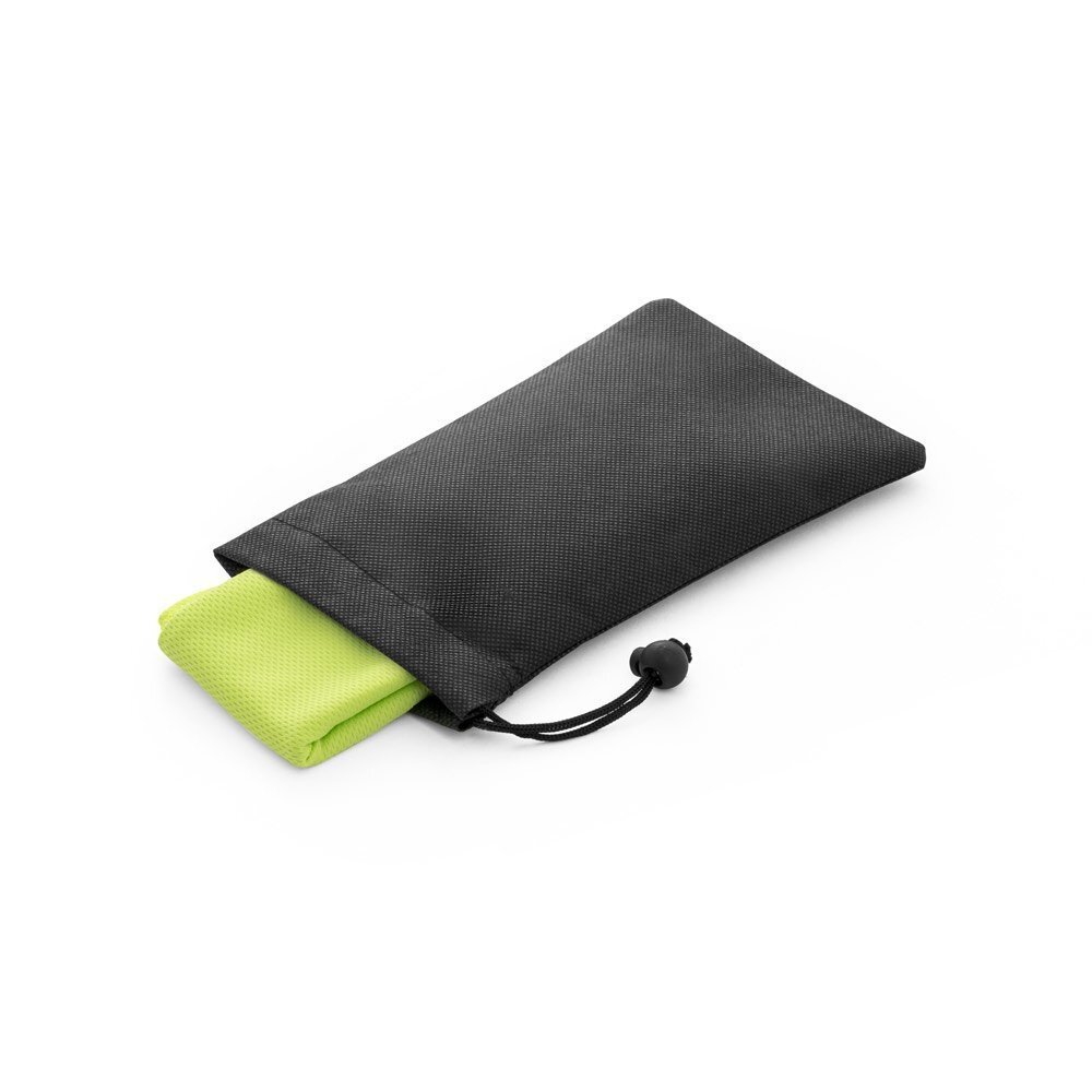 Asciugamano sport rinfrescante in rPET. Fornito in una borsa nera in tnt. Asciugamano riutilizzabile, lavabile in lavatrice.Asciugamano: 300 x 800 mm | Custodia: 100 x 200 mm