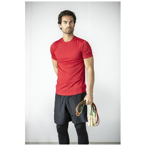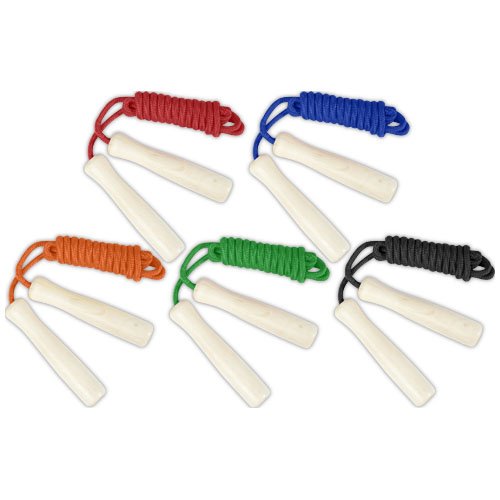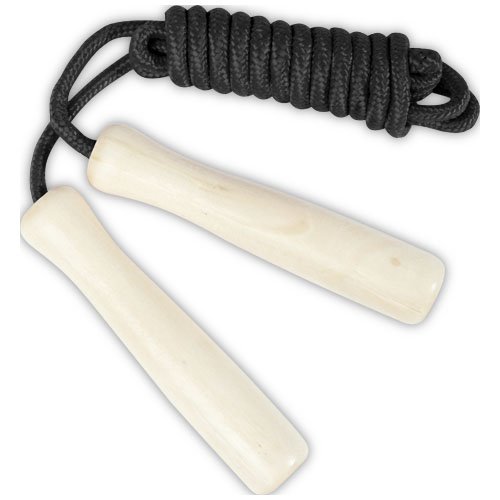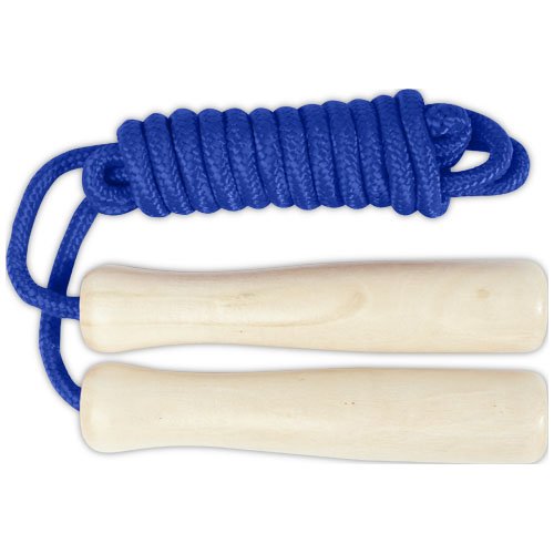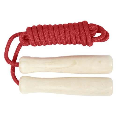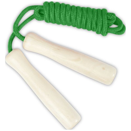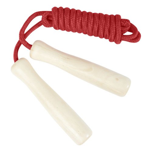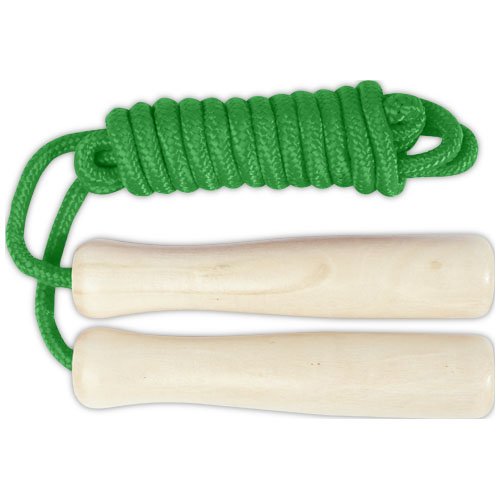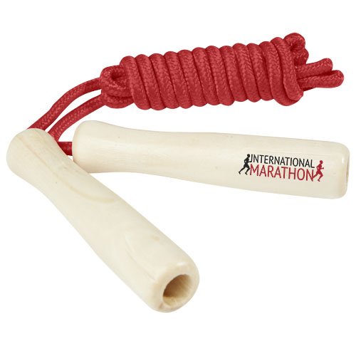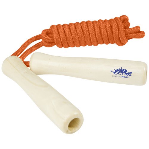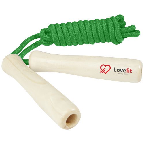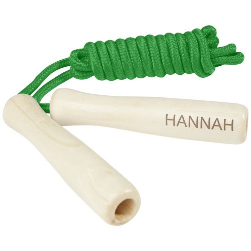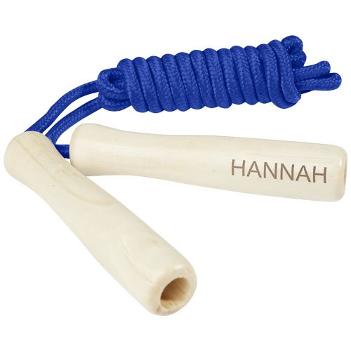 Corda in poliestere disponibile in diversi colori e manici realizzati in legno. La lunghezza della corda è di 245 cm ed è adatta per i bambini alti fino a 160 cm. L'incisione laser è consigliata come opzione di stampa ecosostenibile.