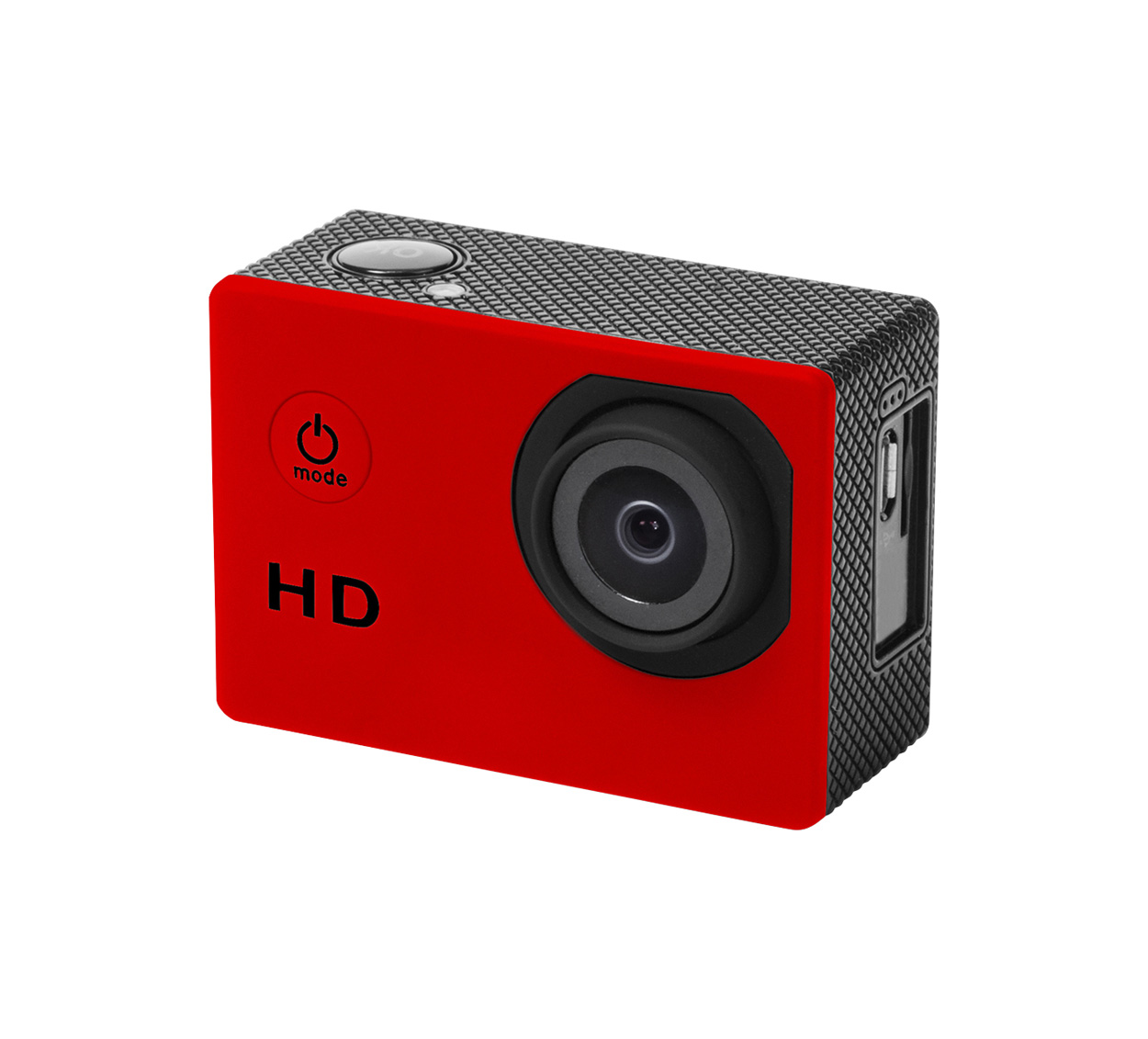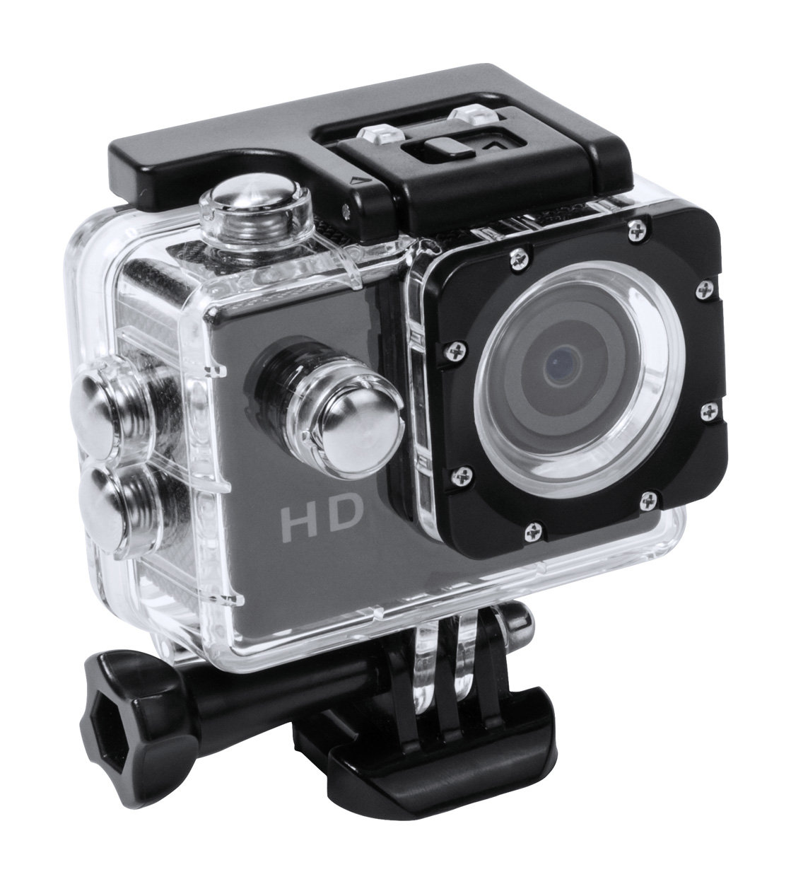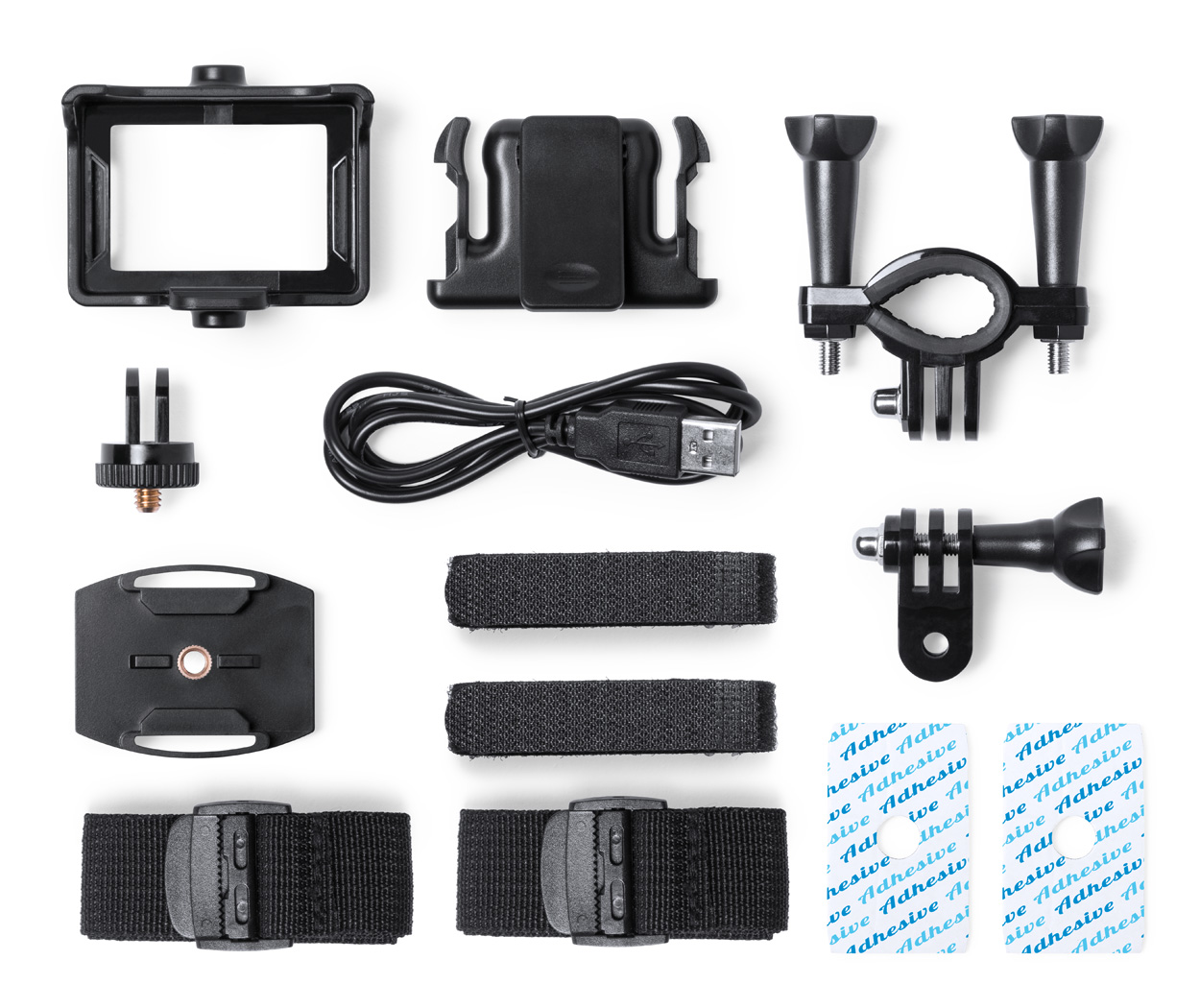 Videocamera sportiva con risoluzione 720p HD, corpo in plastica, schermo 2" LCD e batteria ricaricabile. Compreso 14 accessori e cavo di ricarica USB.