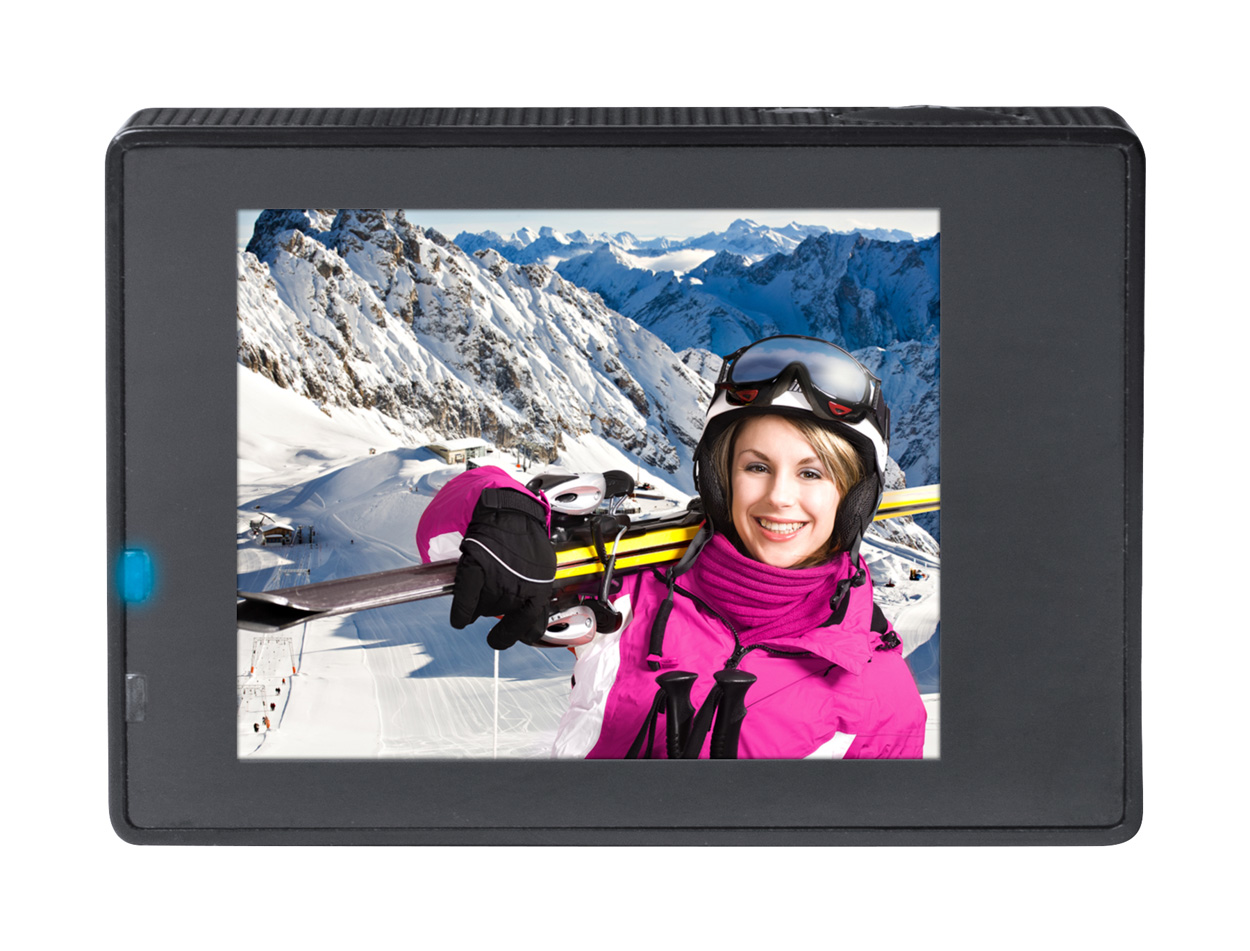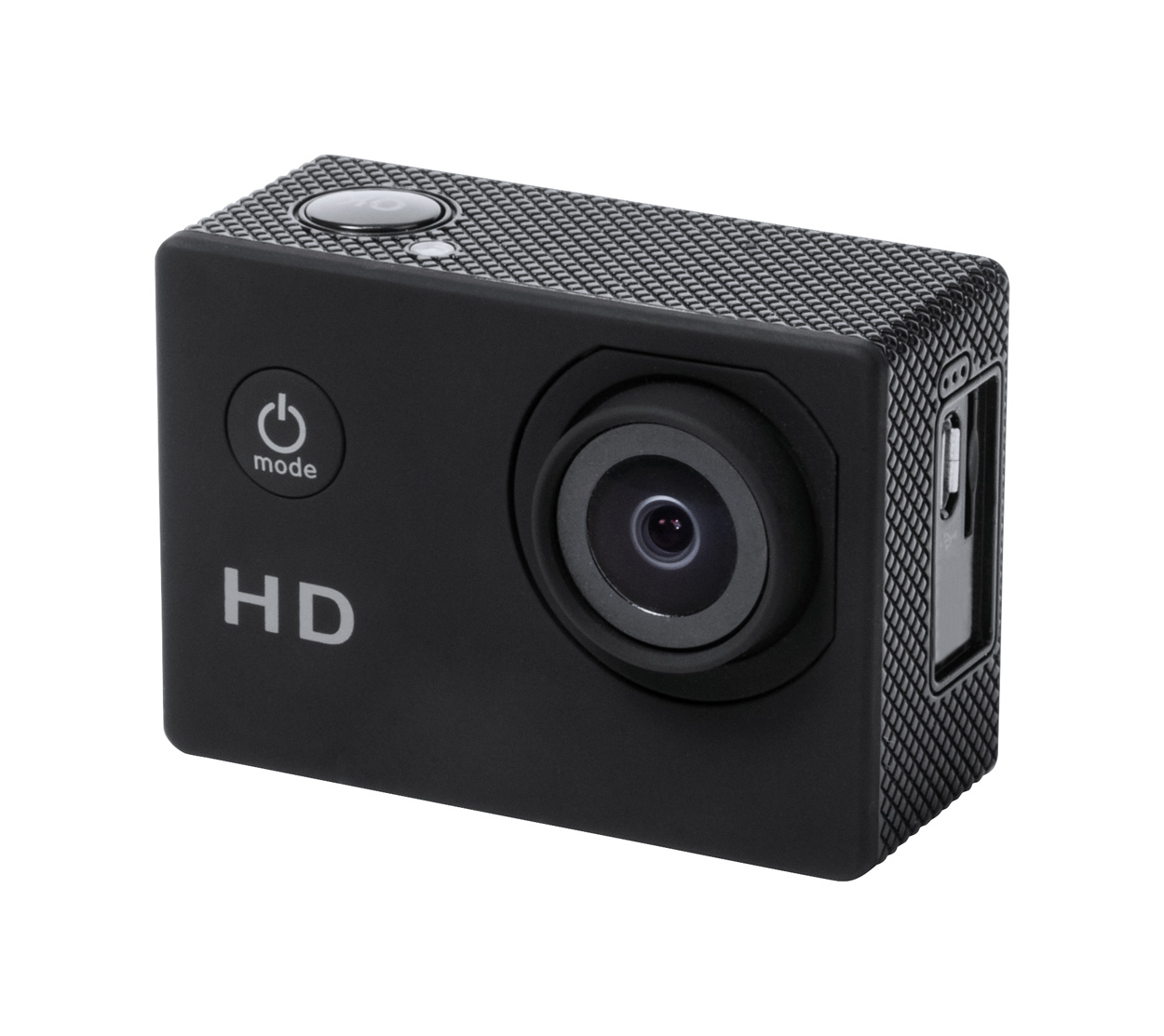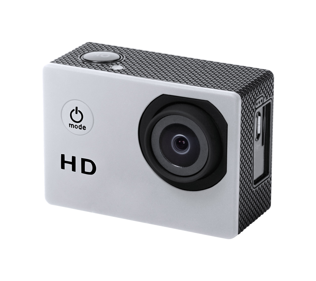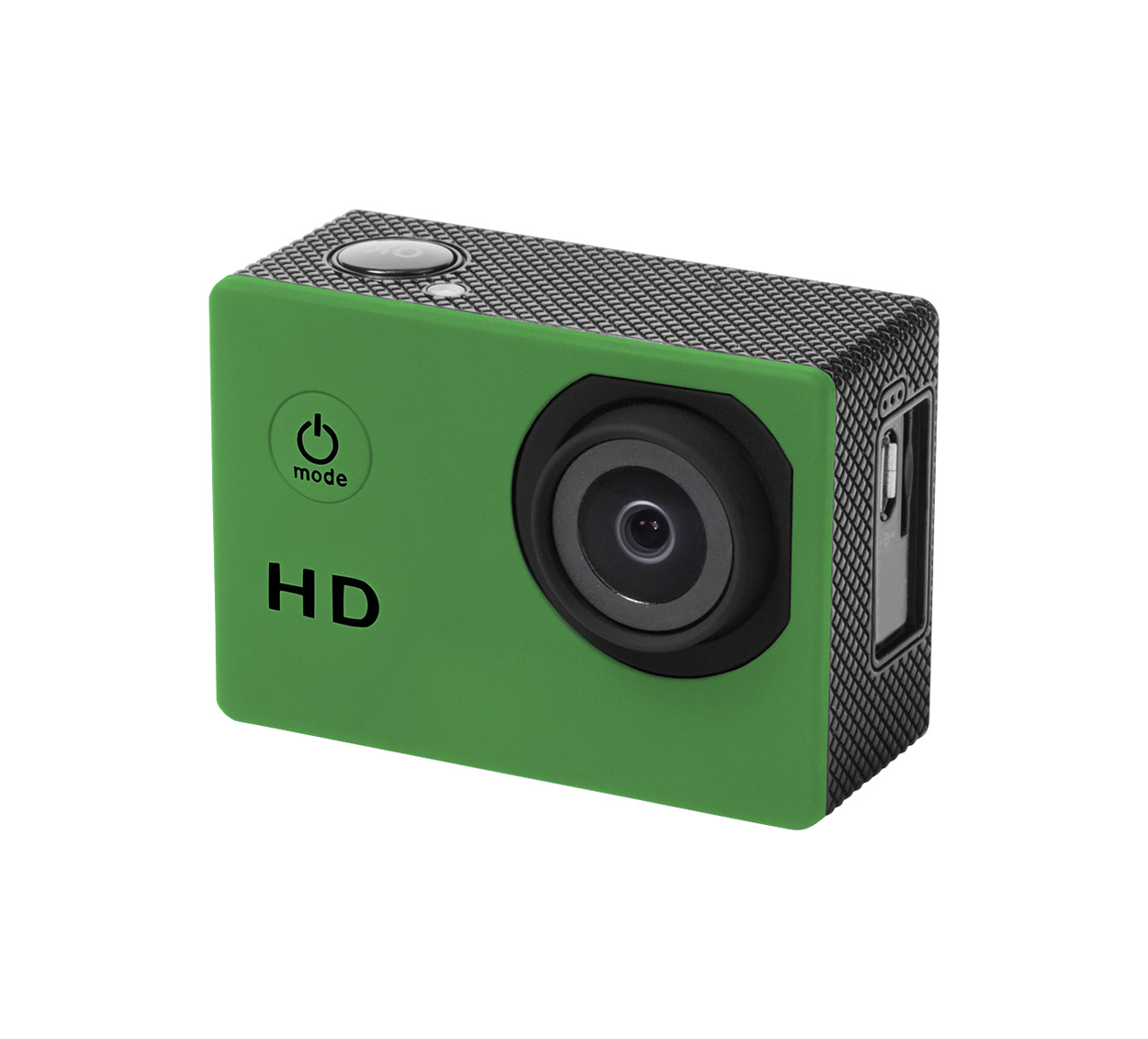 Videocamera sportiva con risoluzione 720p HD, corpo in plastica, schermo 2" LCD e batteria ricaricabile. Compreso 14 accessori e cavo di ricarica USB.