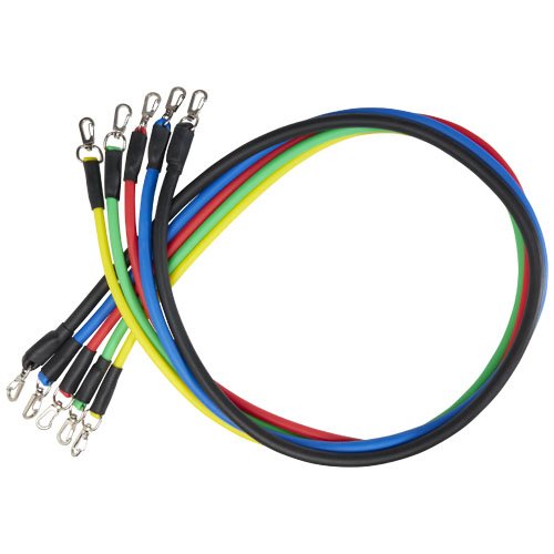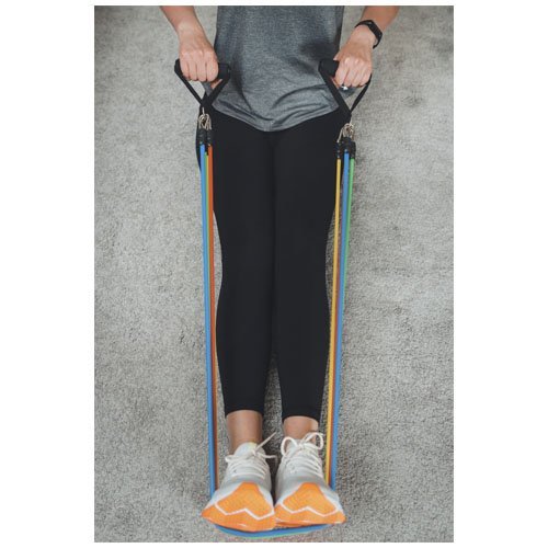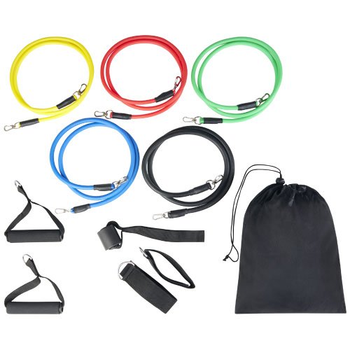 Set di fasce elastiche versatile, da uomo e da donna, ideale per allenarsi a casa. Le fasce elastiche sono lunghe 110 cm e dispongono di 2 fibbie resistenti, sono realizzate in materiale TPE e sono disponibili in 5 colori che corrispondono a 5, 7,5, 10, 12,5 e 15 kg di resistenza. Il set include anche 2 maniglie, 2 cinghie per le caviglie e 1 gancio per la porta. Fornito in una custodia da 32 x 23 cm realizzata in plastica PET riciclata, la cui superficie è ideale per stampare un logo.