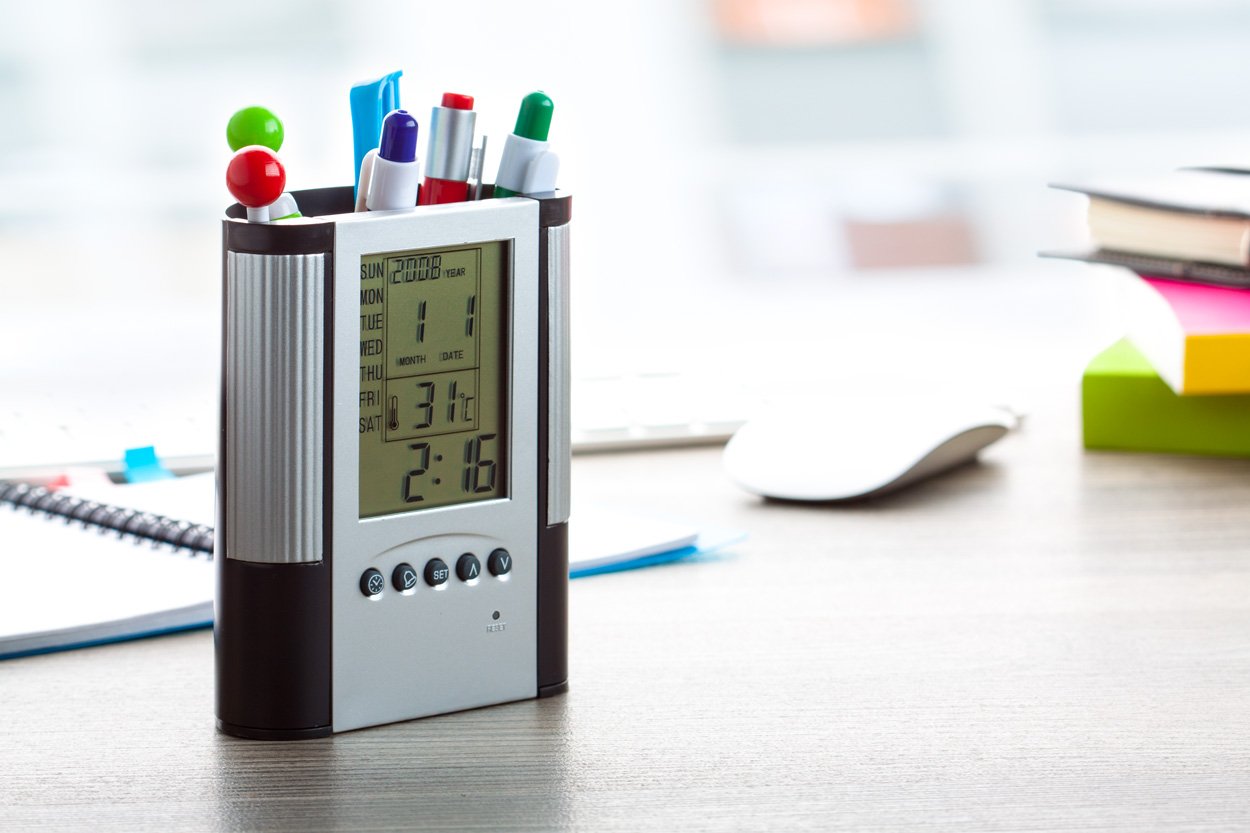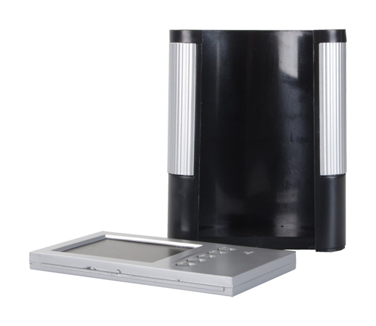 Portapenne in plastica con display digitale, termometro, orologio, sveglia e calendario. Consegnato con batteria a bottone.