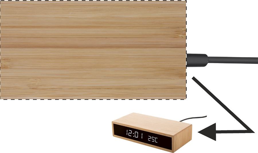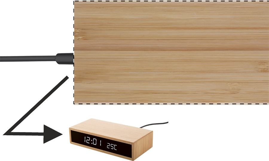 Sveglia multifunzione con corpo in bambù, display a LED, termometro e caricatore wireless incorporato (10W). Cavo di ricarica USB incluso.