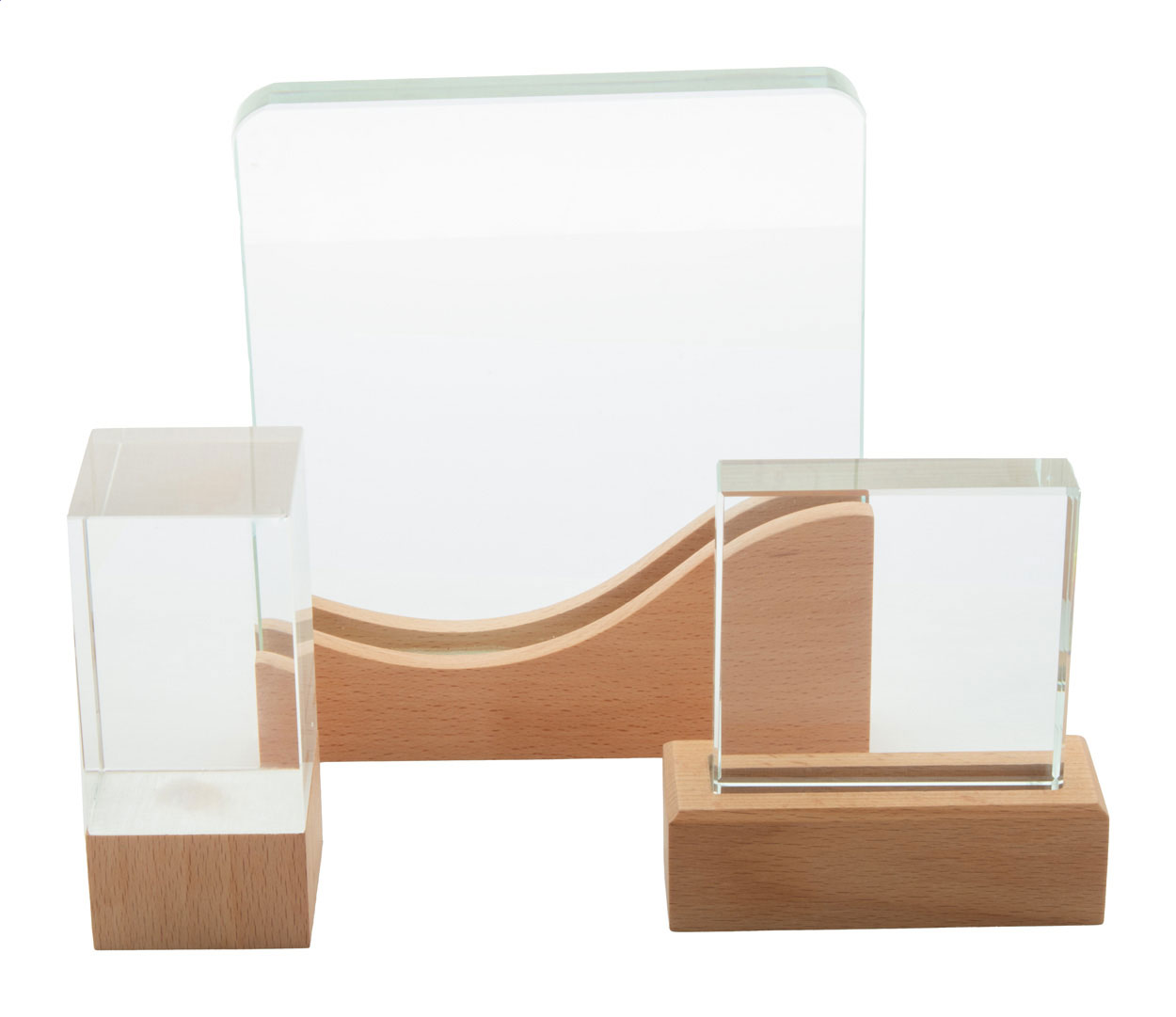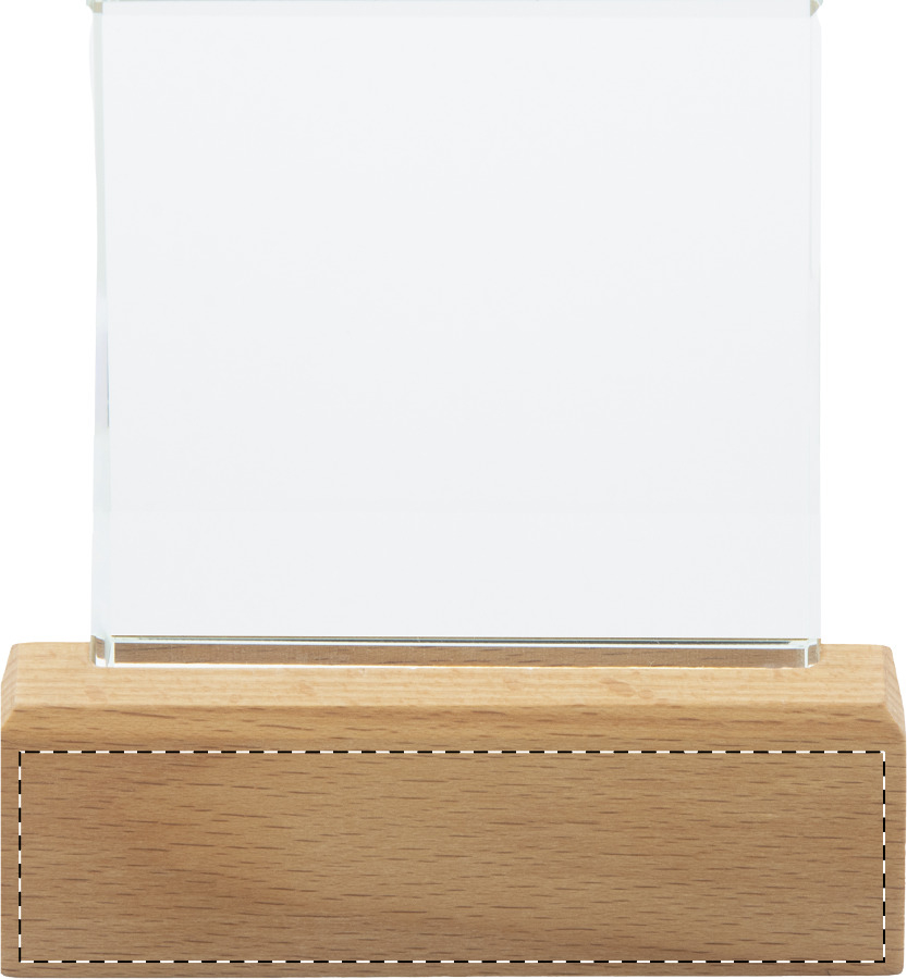 Trofeo in vetro con base in legno di faggio, completo di confezione regalo in cartoncino kraft.