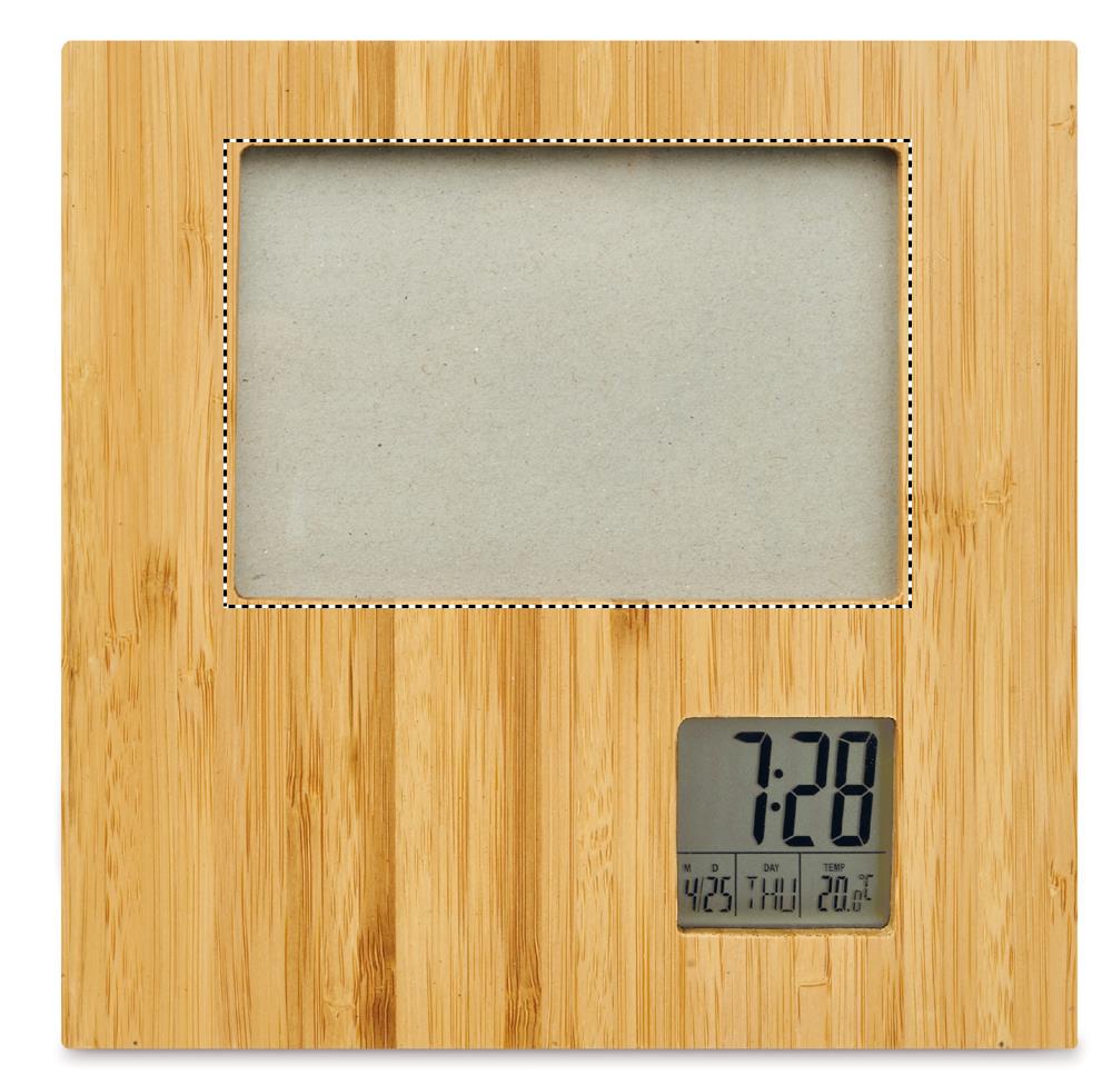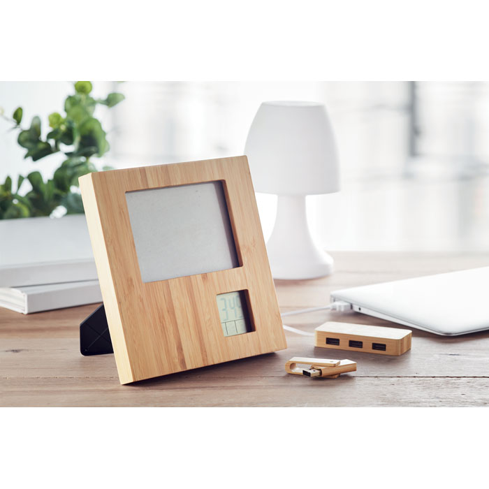 Cornice per foto in bamboo con stazione meteo. Visualizza ora, data e temperatura. Funzione di sveglia, timer e count down. 2 batterie AAA non incluse.