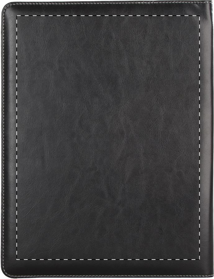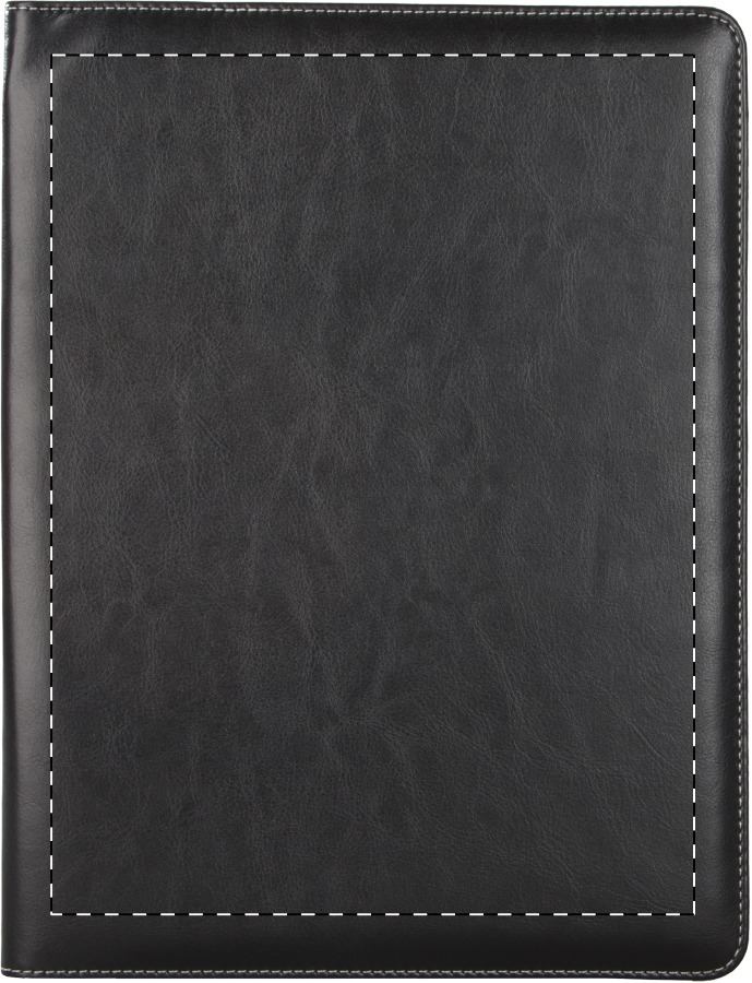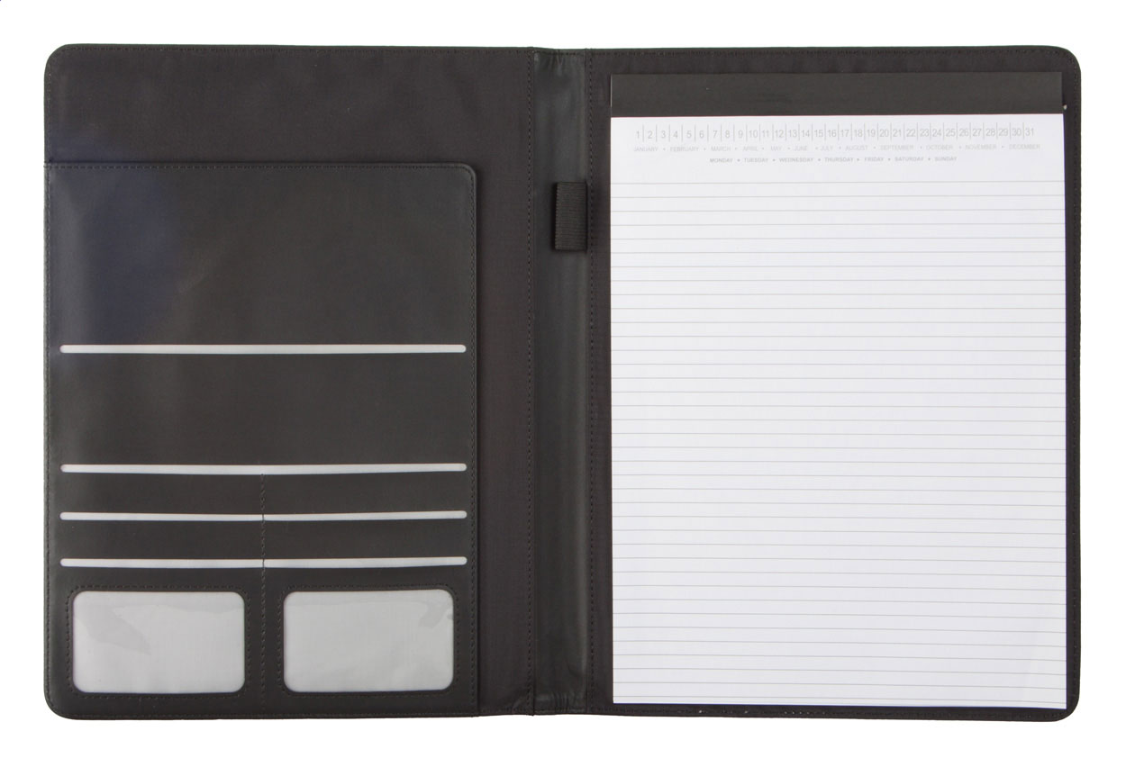 Cartella formato A4 in PU, con blocco da 20 pagine a righe, penna e portabiglietti da visita.