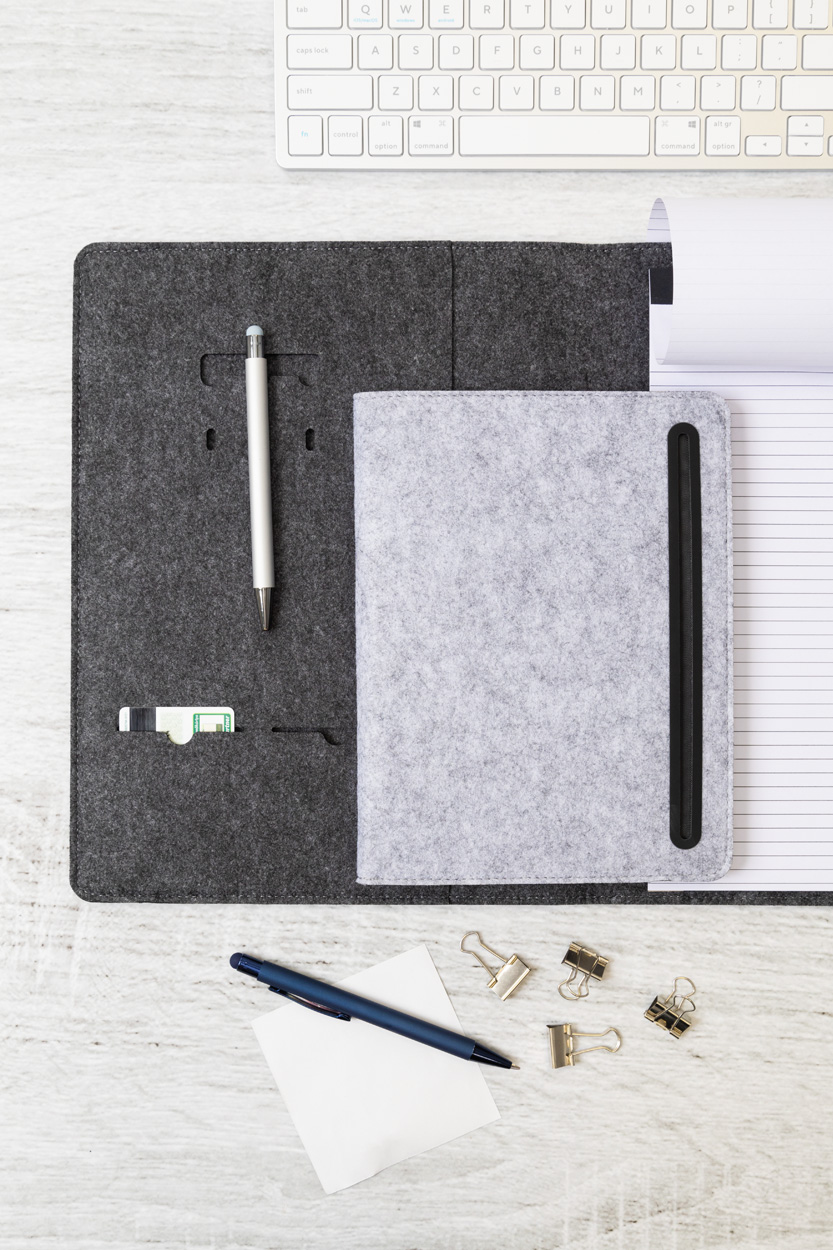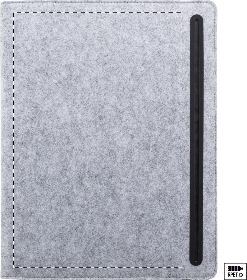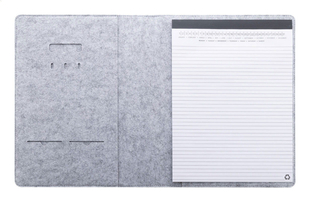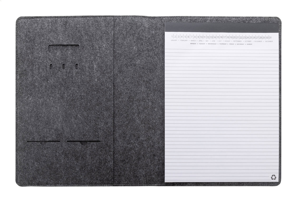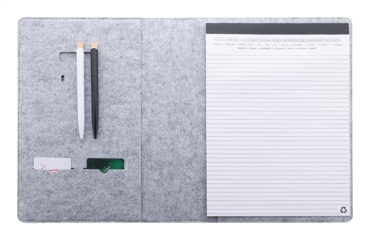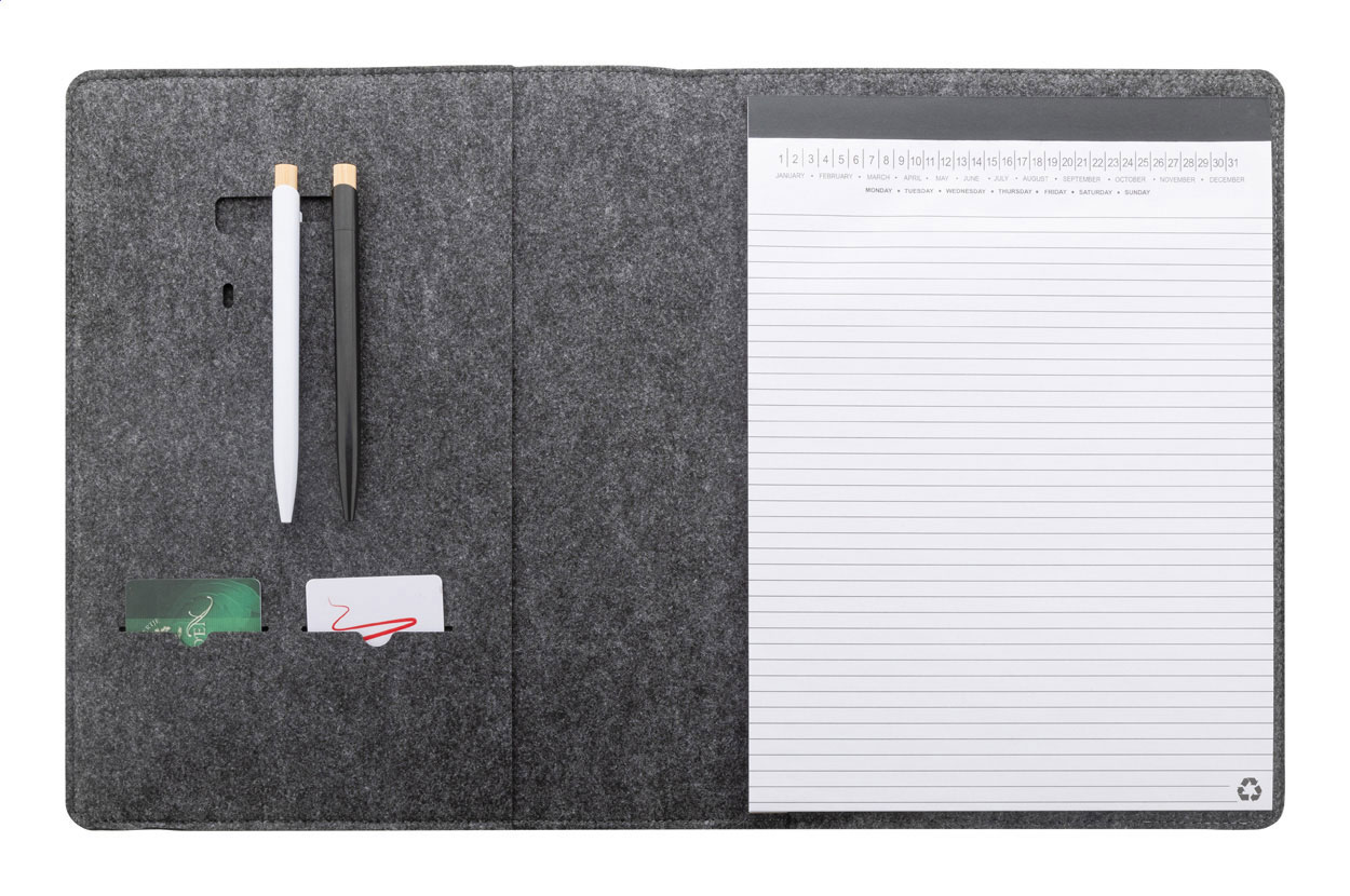Cartella portadocumenti formato A4 in feltro RPET con tasca frontale, varie tasche interne e blocco note da 20 fogli in carta riciclata a righe.