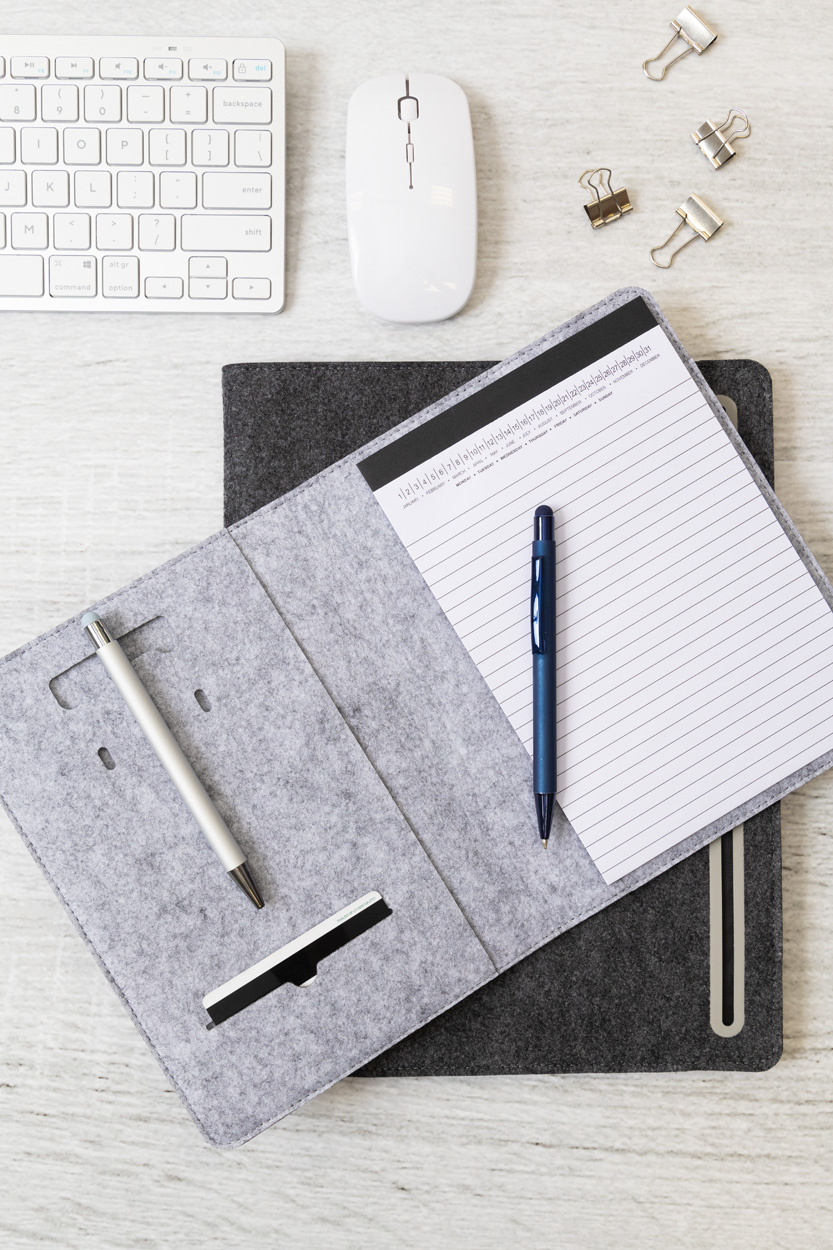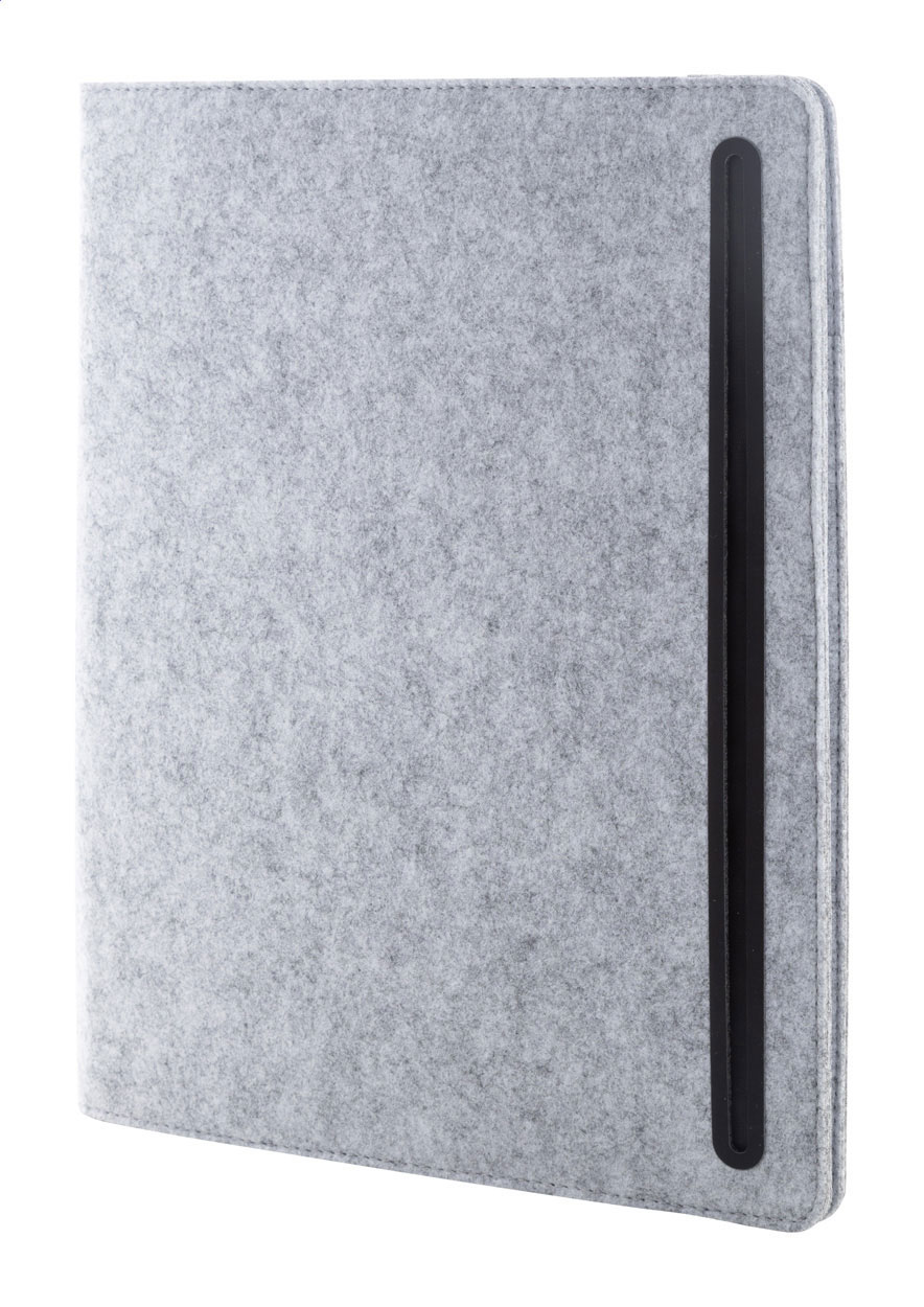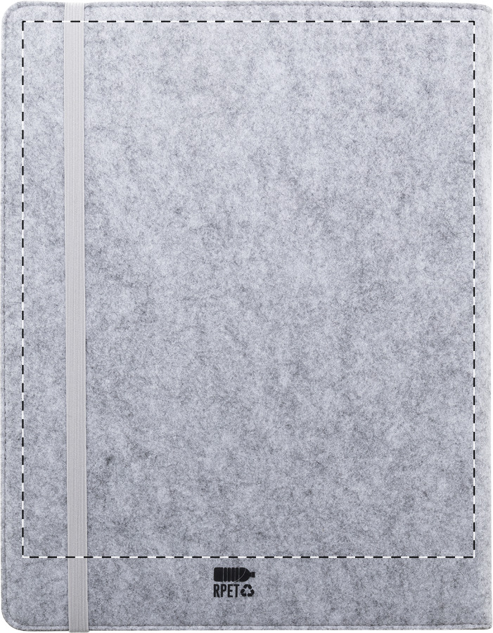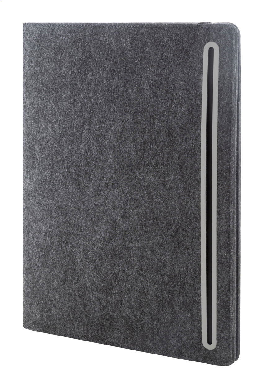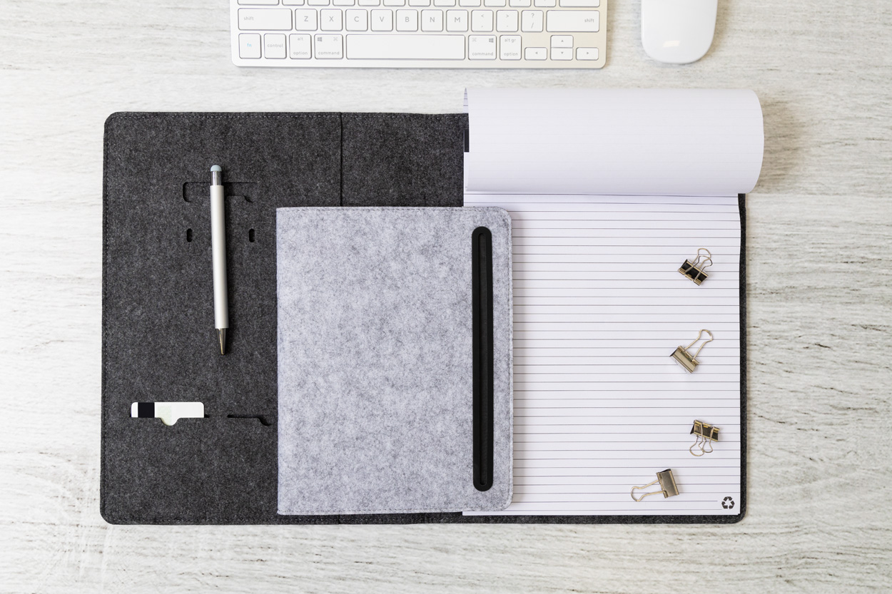 Cartella portadocumenti formato A4 in feltro RPET con tasca frontale, varie tasche interne e blocco note da 20 fogli in carta riciclata a righe.
