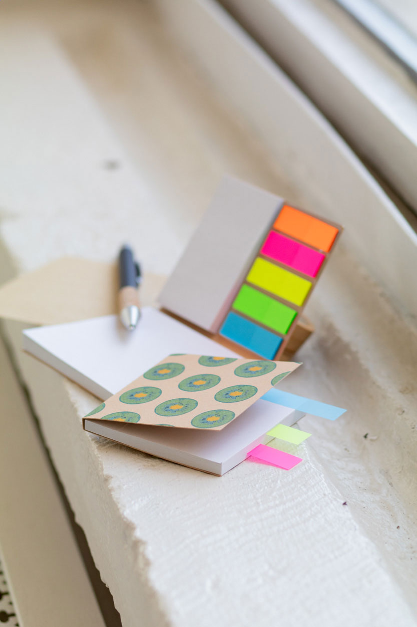 Blocco fogli adesivi personalizzabile con copertina in carta kraft riciclata. Comprende 2 formati di foglietti adesivi in carta riciclata (50 fogli da 100x75 mm, 25 fogli da 50x75 mm) e 100 segnapagina disponibile in pellicola di plastica in 5 colori assortiti (44x12 mm). Il prezzo include la stampa a colori sul fronte del segnalibro. Ordine minimo: 100 pz.