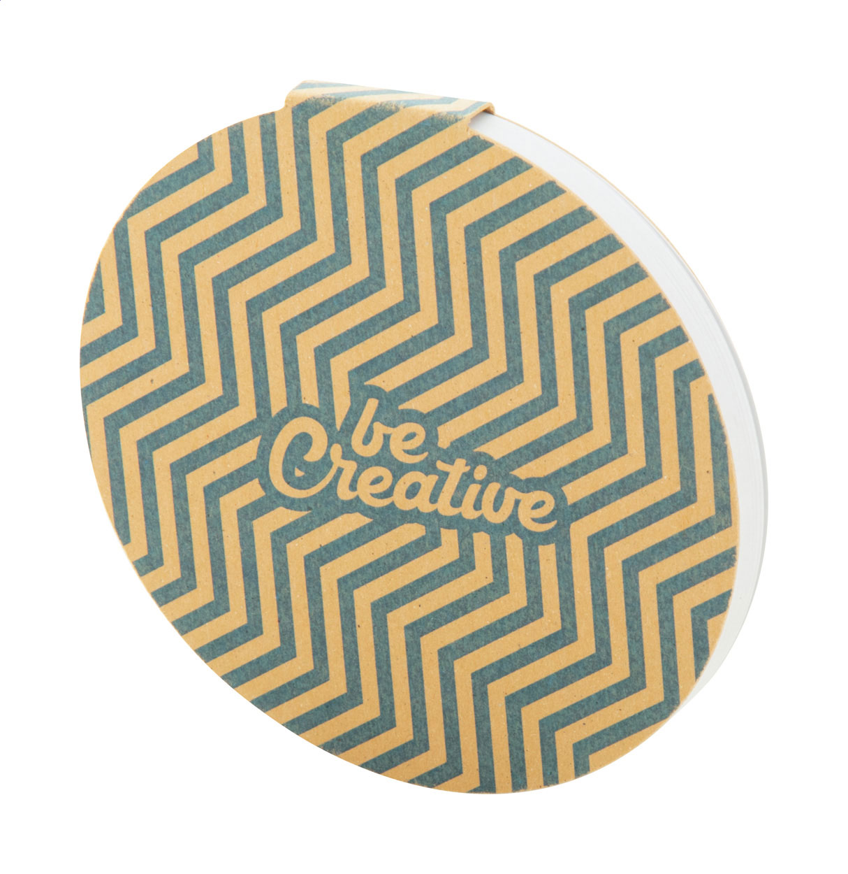 Blocco di 50 foglietti adesivi di forma rotonda con copertina in cartoncino kraft. Il costo comprende la stampa a colori della copertina esterna. MOQ: 100 pezzi.