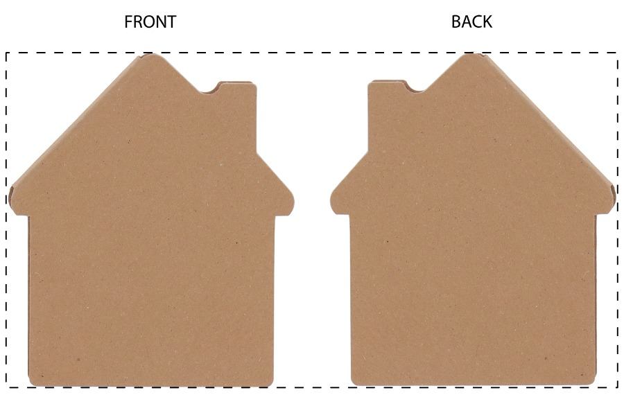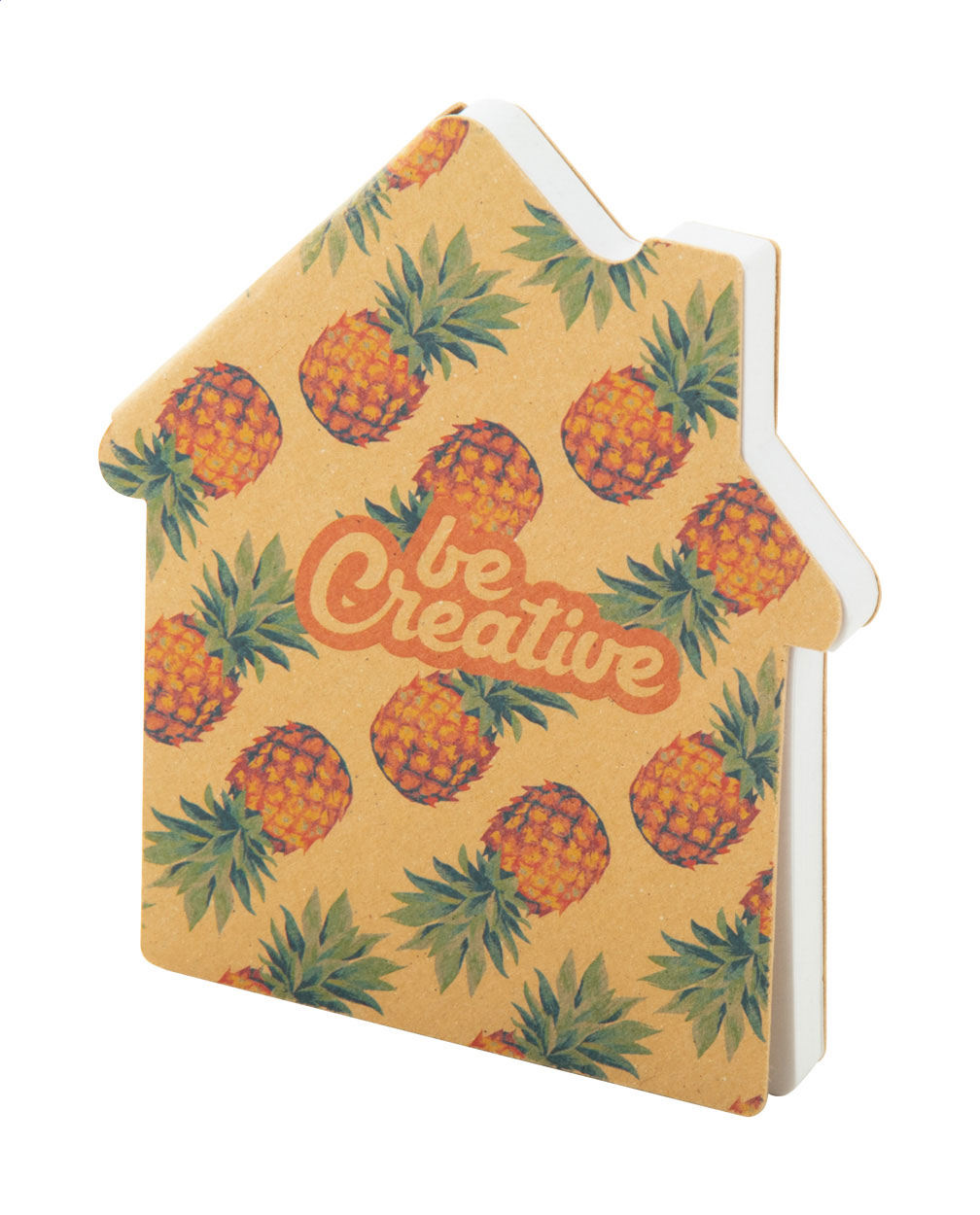 Blocco di 50 foglietti adesivi a forma di casa con copertina in cartoncino kraft. Il costo comprende la stampa a colori della copertina esterna. MOQ: 100 pezzi.