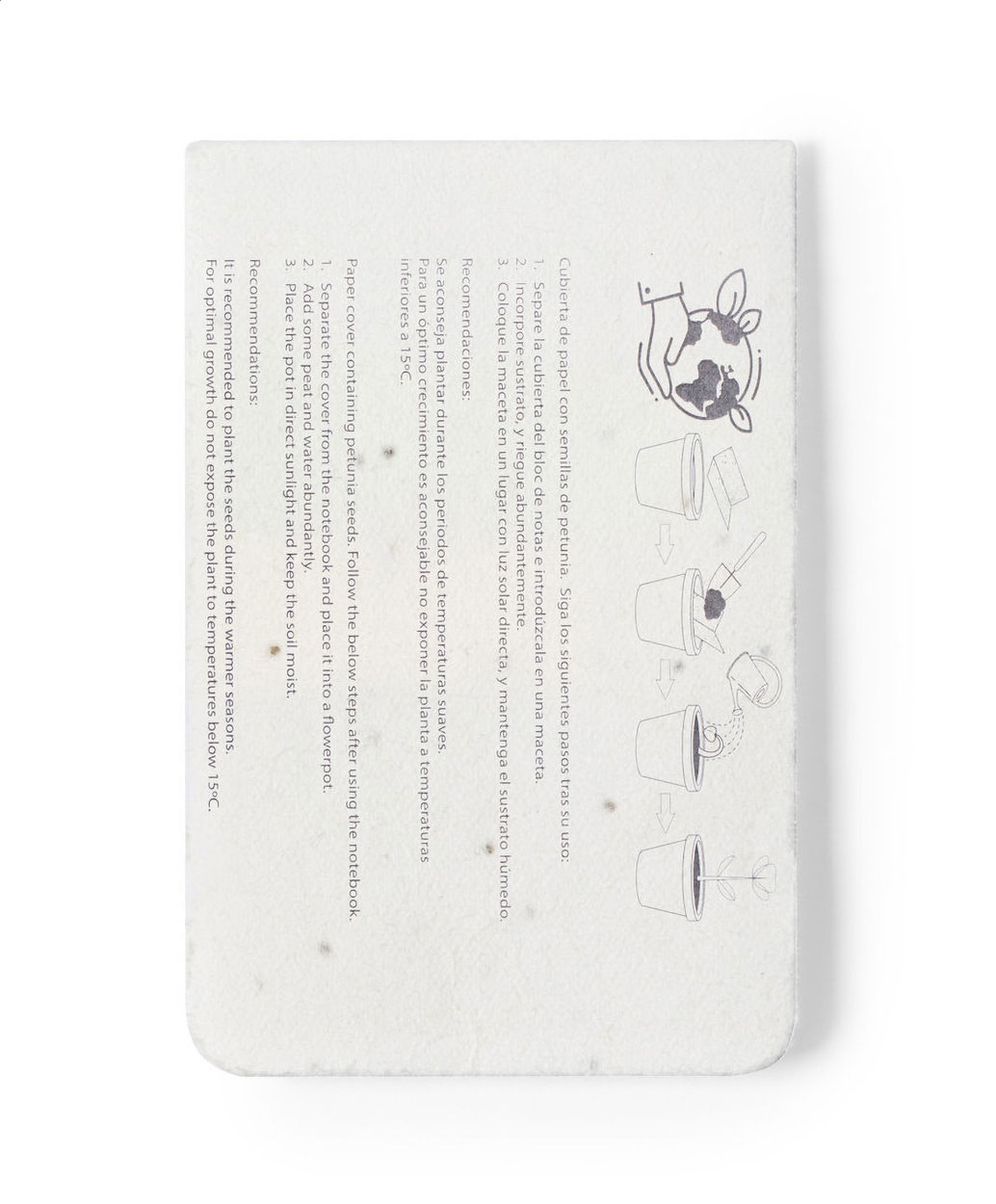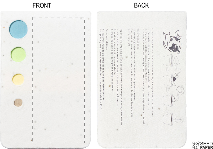 Set 10 foglietti adesivi e 30 segnapagina (3 colori assortiti) in carta riciclata con copertina in carta di semi. La copertina contiene semi di petunia in colori assortiti, che possono essere piantati separando la copertina dal blocco.