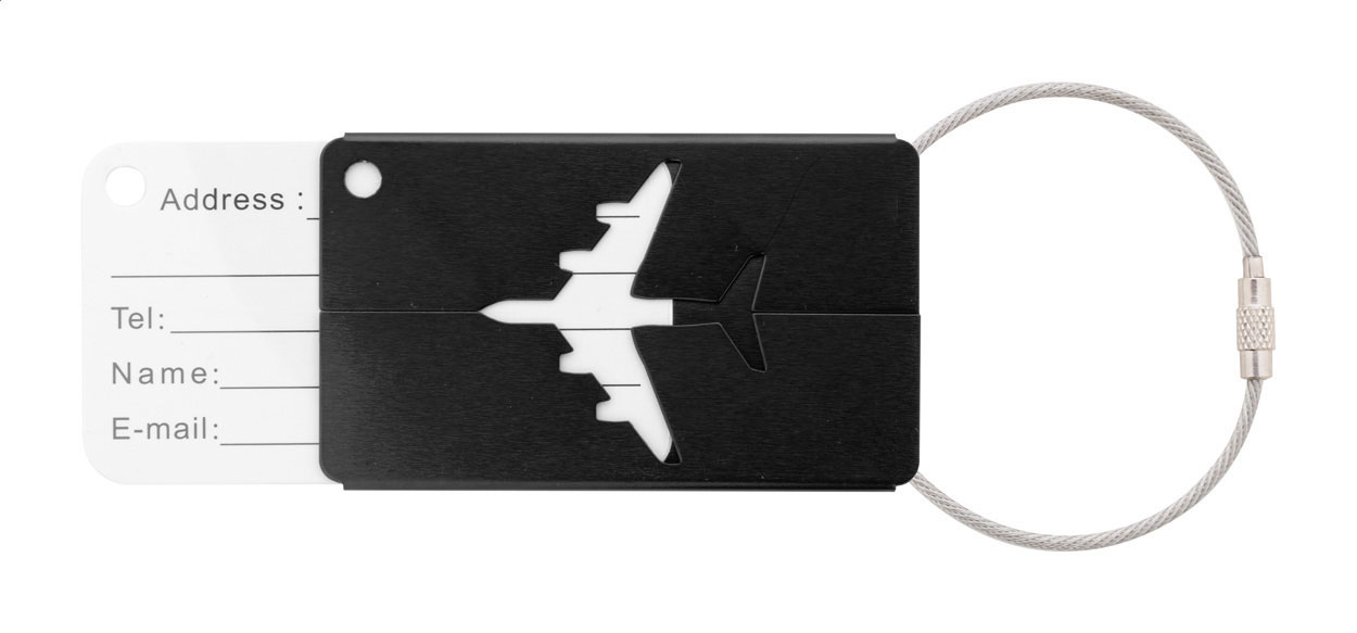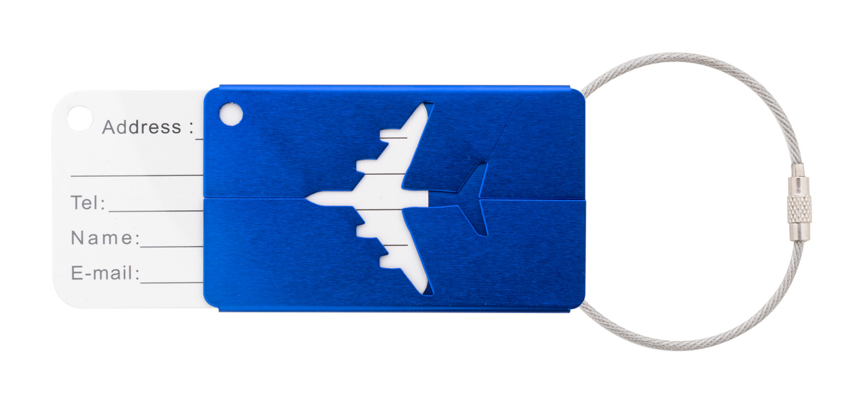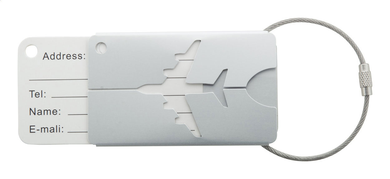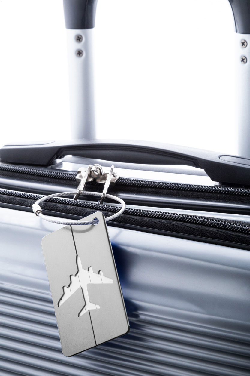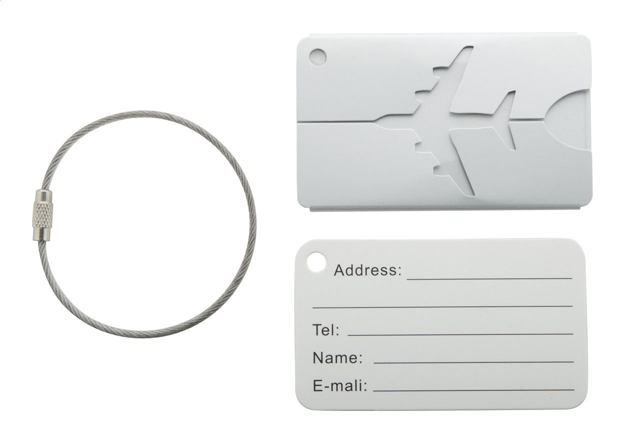 Etichetta per bagagli in alluminio e laccetto in metallo.