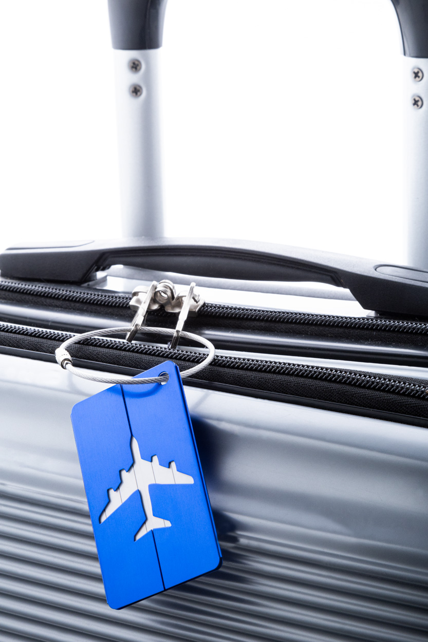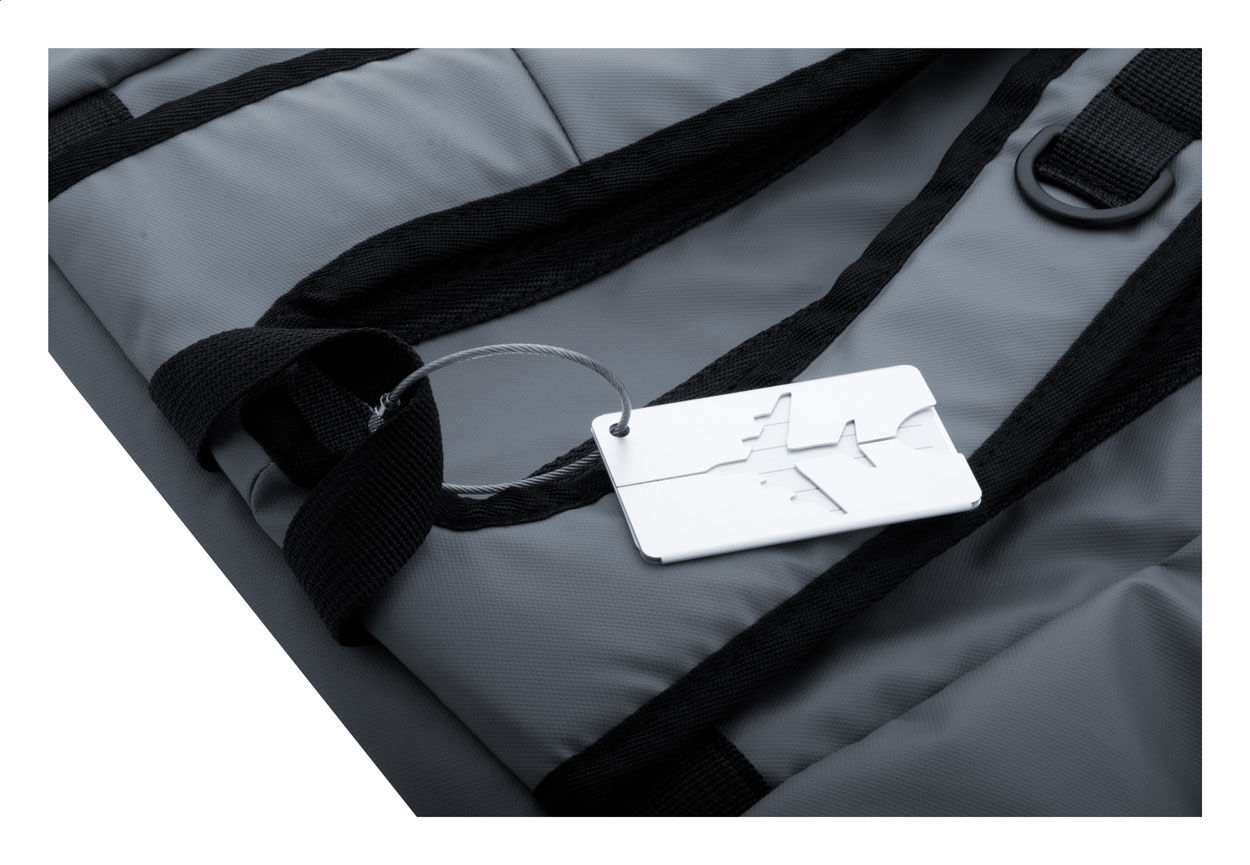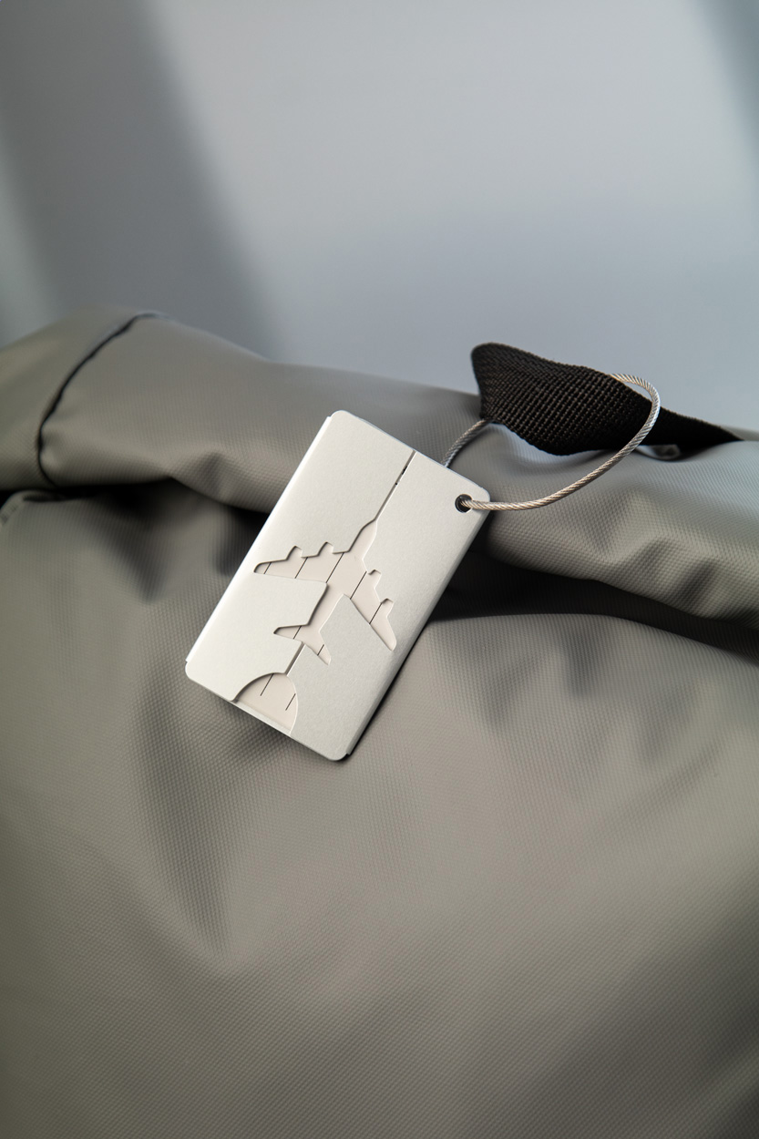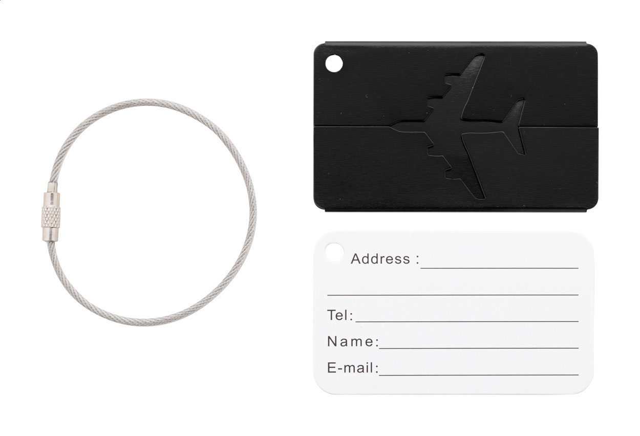 Etichetta per bagagli in alluminio e laccetto in metallo.