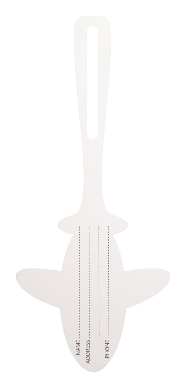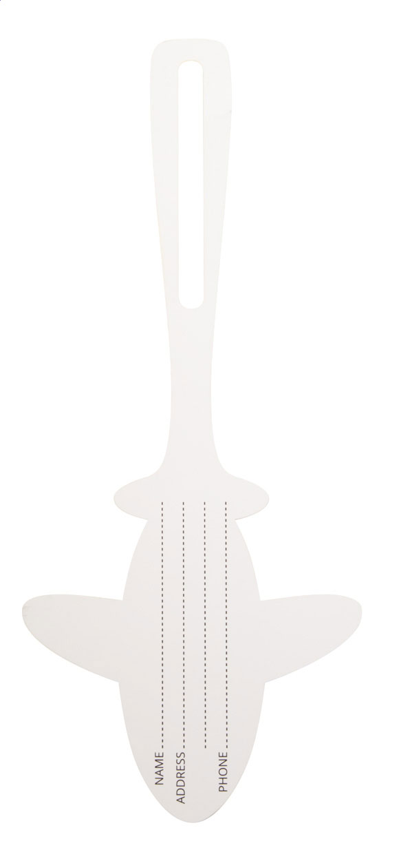 Etichetta per bagaglio antistrappo e resistente all'acqua, a forma di aereo. Il prezzo include la stampa sul lato frontale. Quantità minima: 250 pezzi.