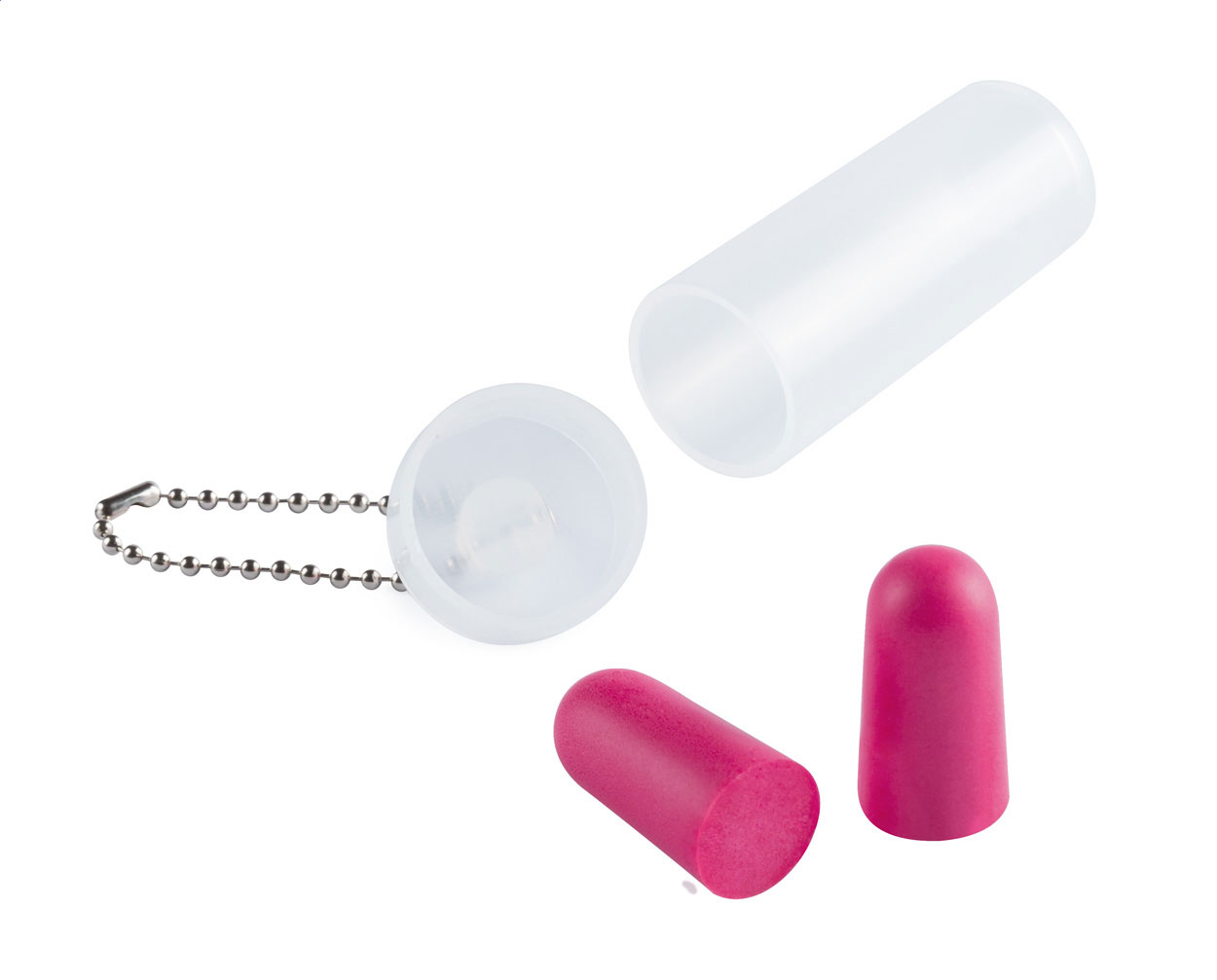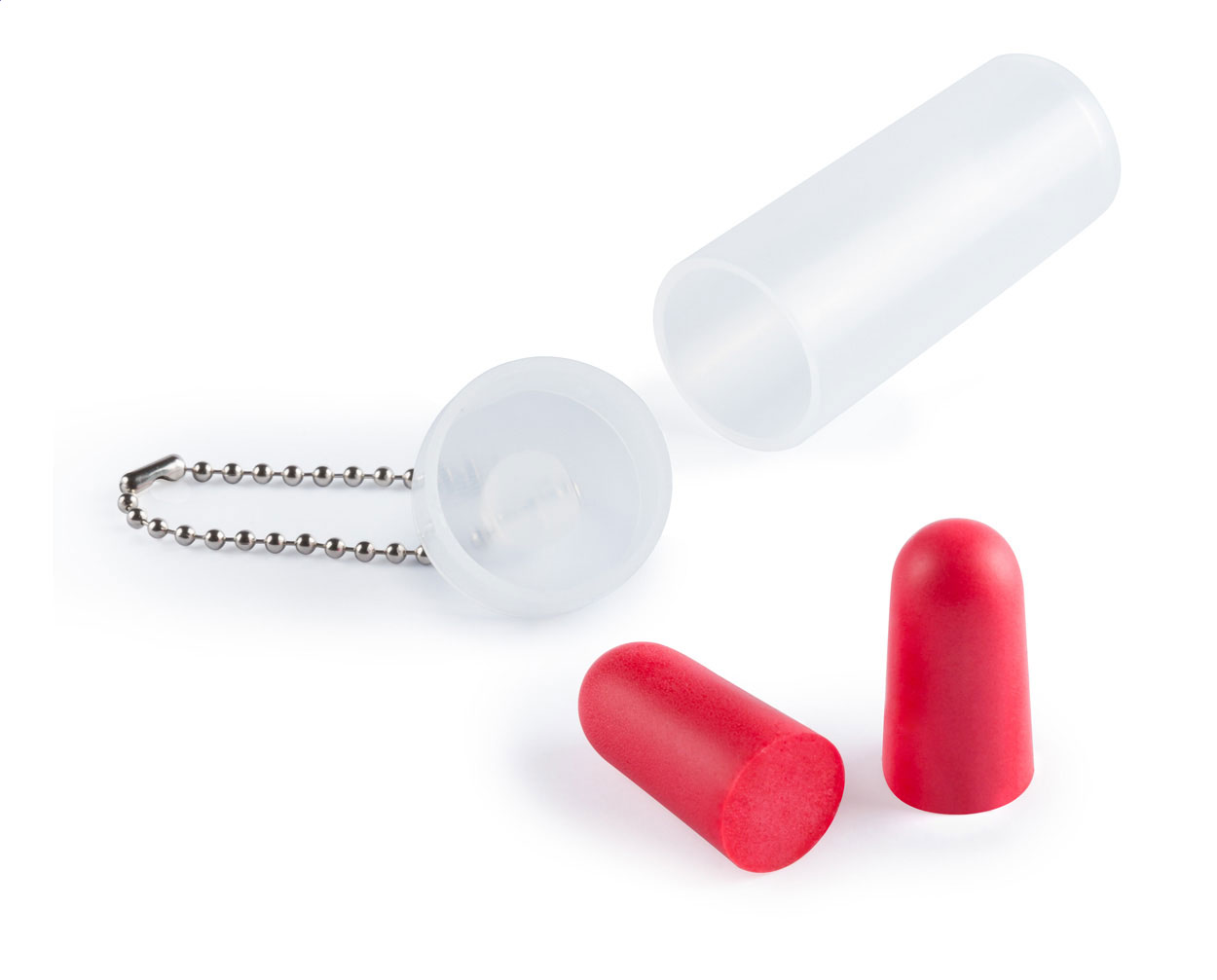Tappi colorati per orecchie in EVA con custodia in plastica trasparente e catenella in metallo.
