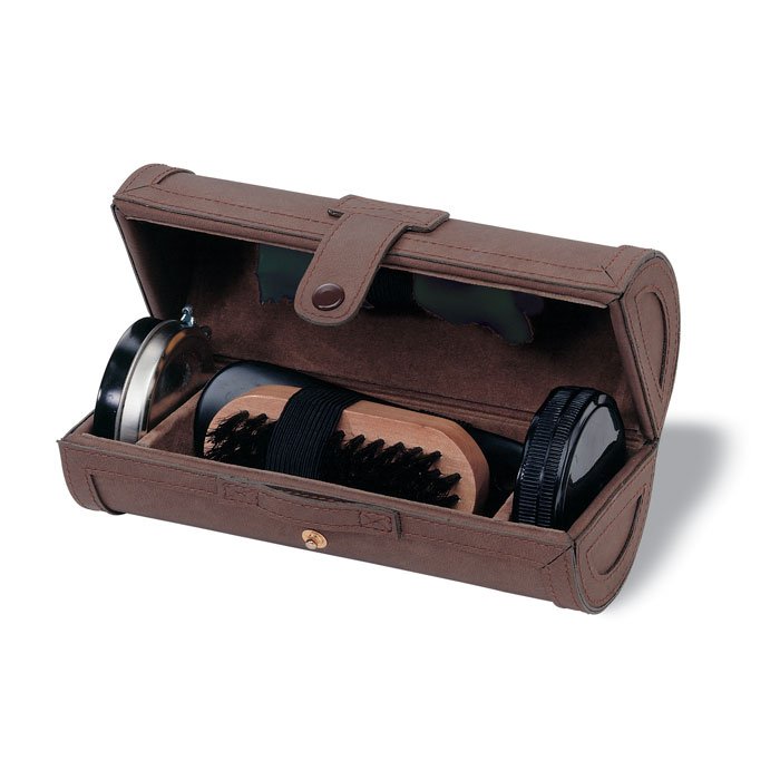 Kit lucida scarpe di lusso da 5 pezzi in confezione regalo. Questo set comprende un panno nero per scarpe, un calza scarpe, una spazzola di legno, una spugna per lucidare e un lucido di colore neutro.