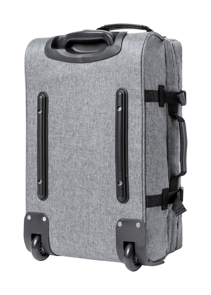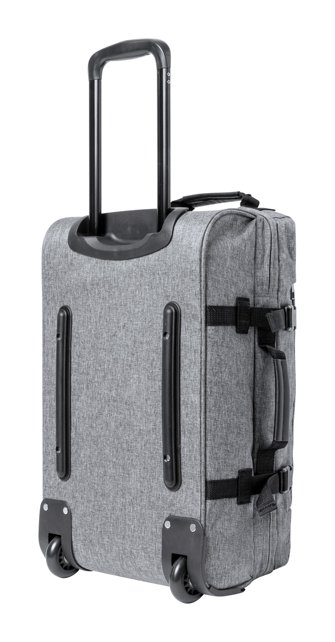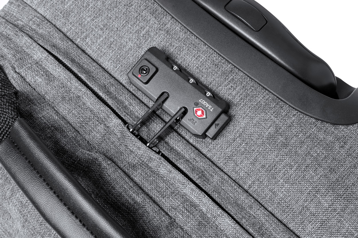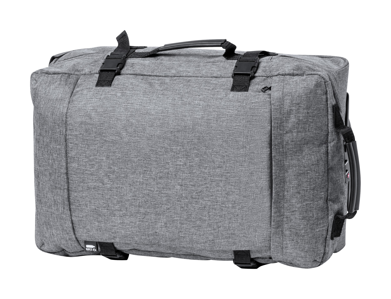 Borsone trolley in poliestere 300D RPET con 2 ruote, maniglia telescopica, chiusura a combinazione TSA ed etichetta RPET.