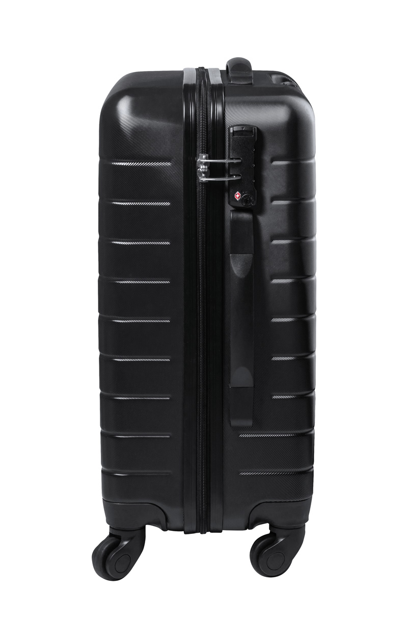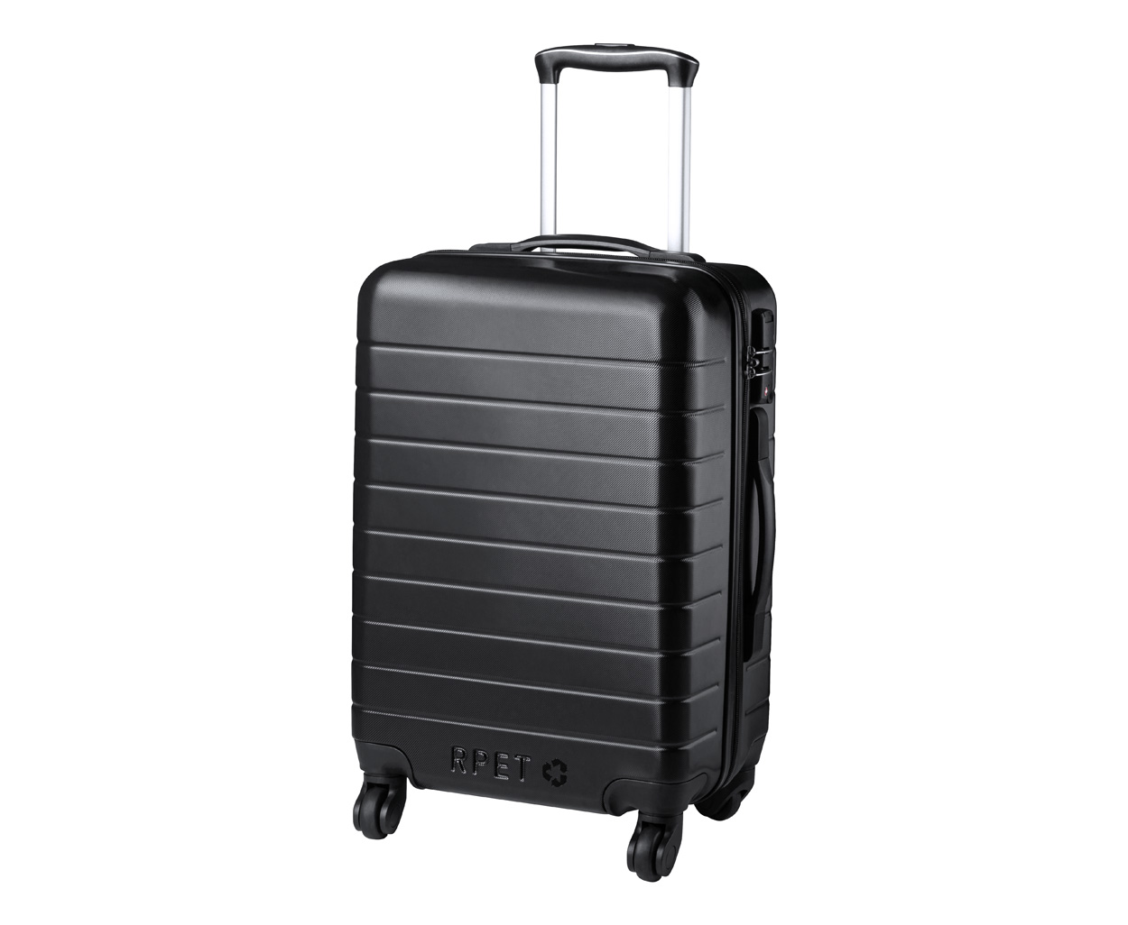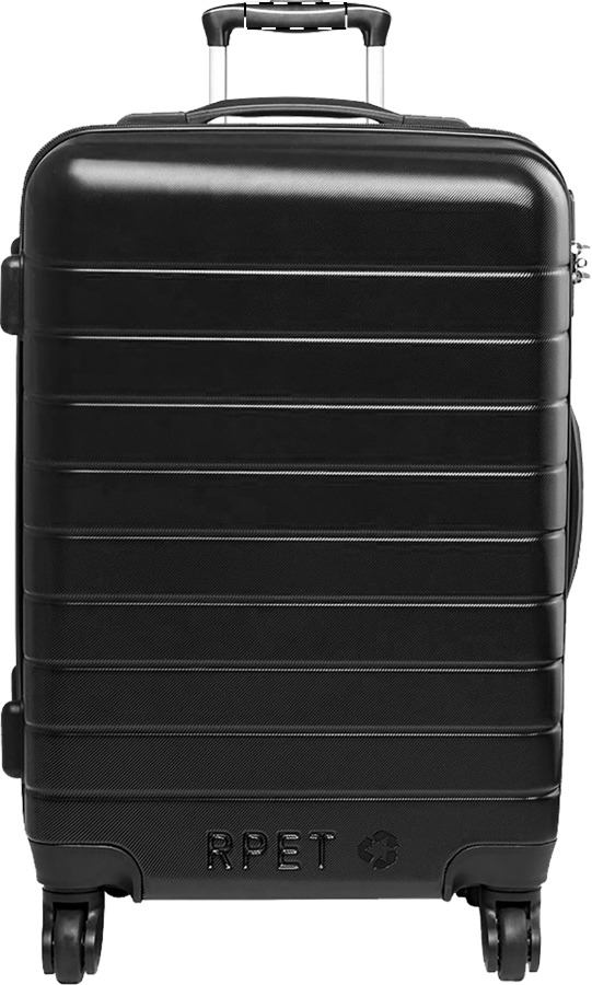 Trolley in plastica RPET con 4 ruote doppie, manico telescopico e chiusura a combinazione TSA. Con fodera interna in RPET e cinghie di fissaggio elastiche. Con etichetta RPET.